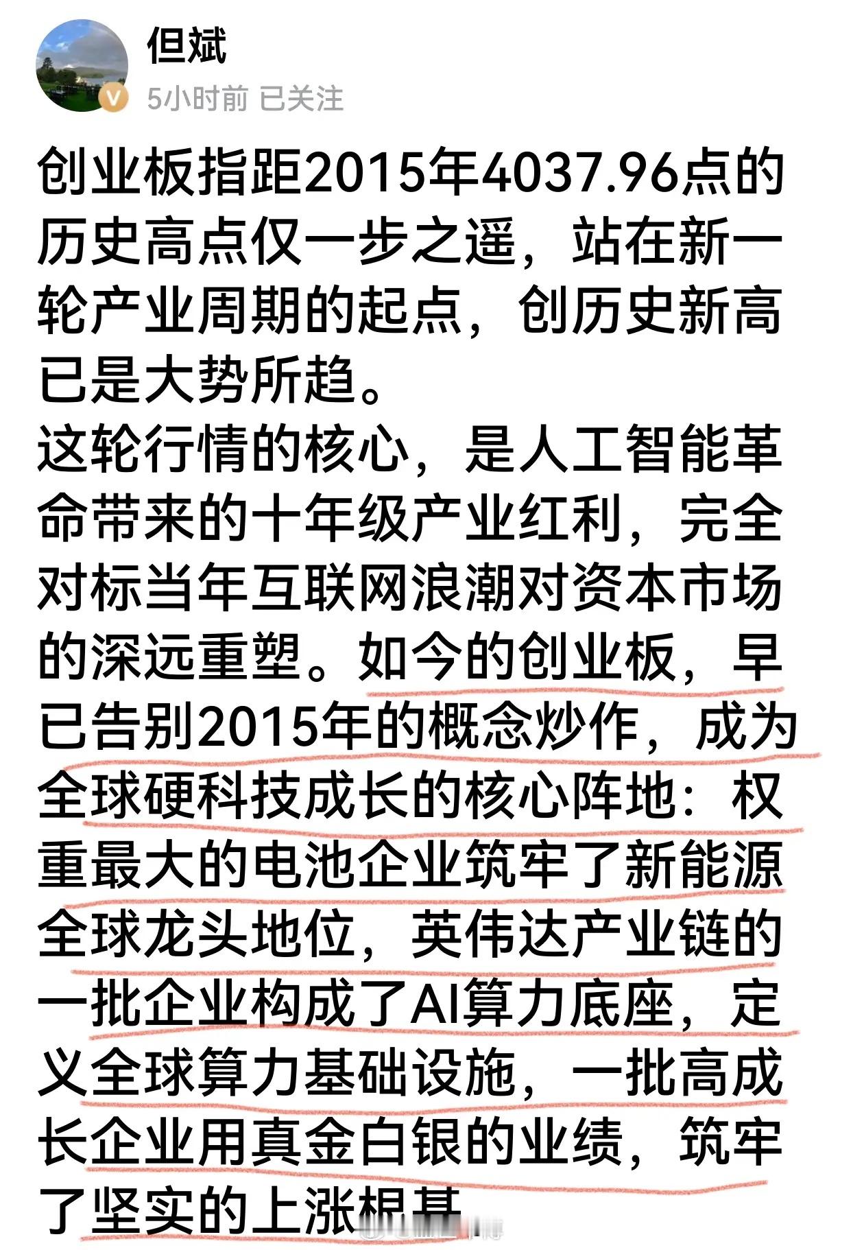 但斌关注创业板了,“全球硬科技成长的核心阵地”,还是非常看好的。2015年创业板创下历史高点——4037点,目前指数离这一高点一步之遥,但斌认为站在新一轮产业周期的起点,创出历史新高点已是大势所趋。科创板确实有点相纳斯达克了,科技股唱主角,少数科技龙头贡献指数,创业板50前十大权重股,除了东方财富是证券股外,其他的都是科技龙头,锂电池企业2家,光模块企业3家,储能企业1家,印制电路板企业1家,自动控制企业1家,医疗器械企业1家。创业板指数十大权重股基本与创业板50重叠,只是1家养殖企业替代了锂电池企业。这些龙头企业都是在创业板经营爆发,实现市值规模扩张的。创业板集中了一批硬科技企业,本轮行情的主角就是科技股,所以创业板的涨幅远大于上证指数,随着创业板改革措施出台,创业板获得更多政策支持,正如但斌的判断,指数创出新高是大势所趋。对A股而言,就是个结构性行情,对创业板来说,是真正的牛市进行时。