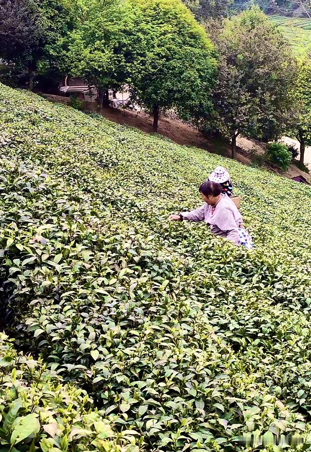 我和五婶从山顶开始采茶,另外几位婶子从山下往山上采茶,我背分晚,和婶子们年龄差不远,
