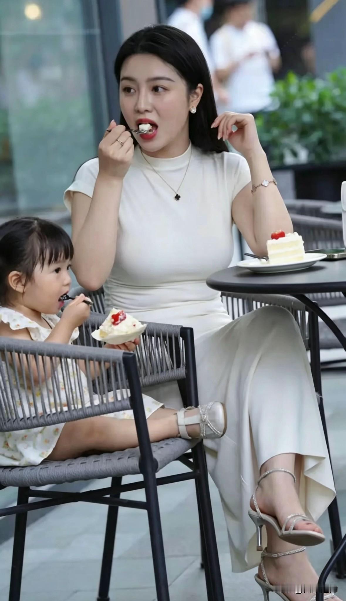 午后的风裹着蛋糕的奶香,漫过露天藤椅。一位年轻的母亲就那样松松散散地坐着,陪小丫头分着一份甜。白裙衬着童真,红唇沾着奶油,母女俩举着小勺,把寻常日子吃得满是蜜意。