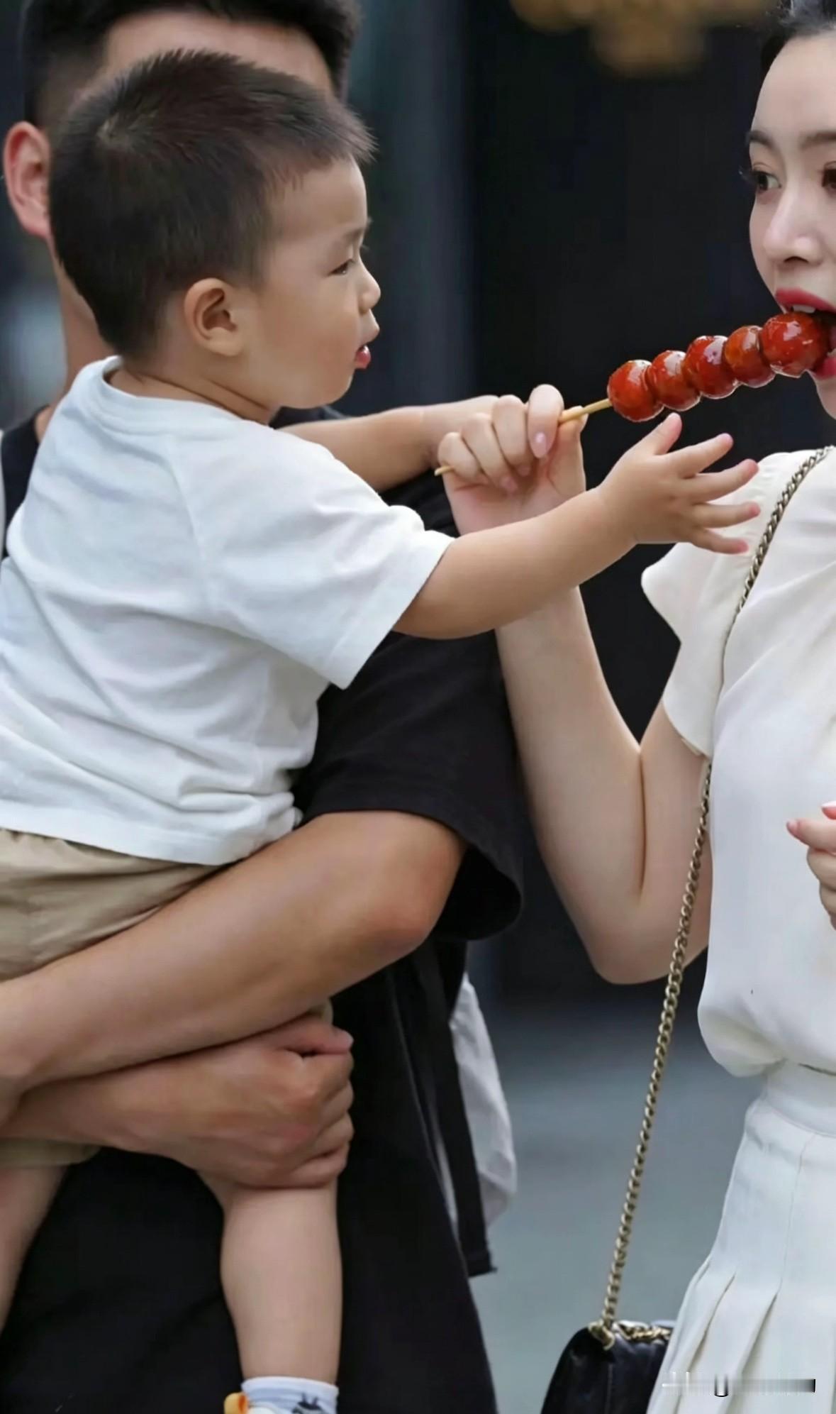 小宝宝伸着胖乎乎的小手,认真把酸甜的糖葫芦递到妈妈嘴边,眼里满是天真亲昵。妈妈笑着张口,眼底藏着化不开的温柔,接住孩子这份纯粹的爱意。爸爸稳稳抱着孩子,安静又宠溺,默默守护着眼前这一幕。