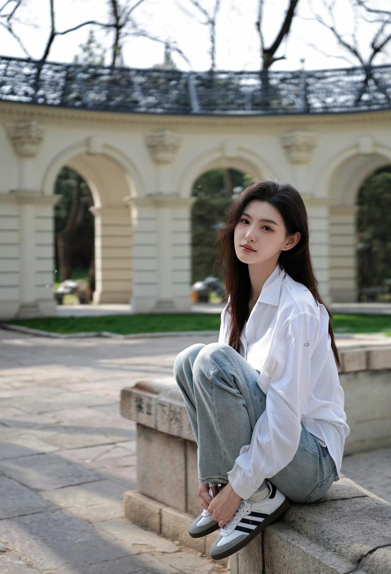 阳光漫过欧式拱廊,白衬衫裹挟着春日的风。 松弛的穿搭,自在的姿态,在光影流转间