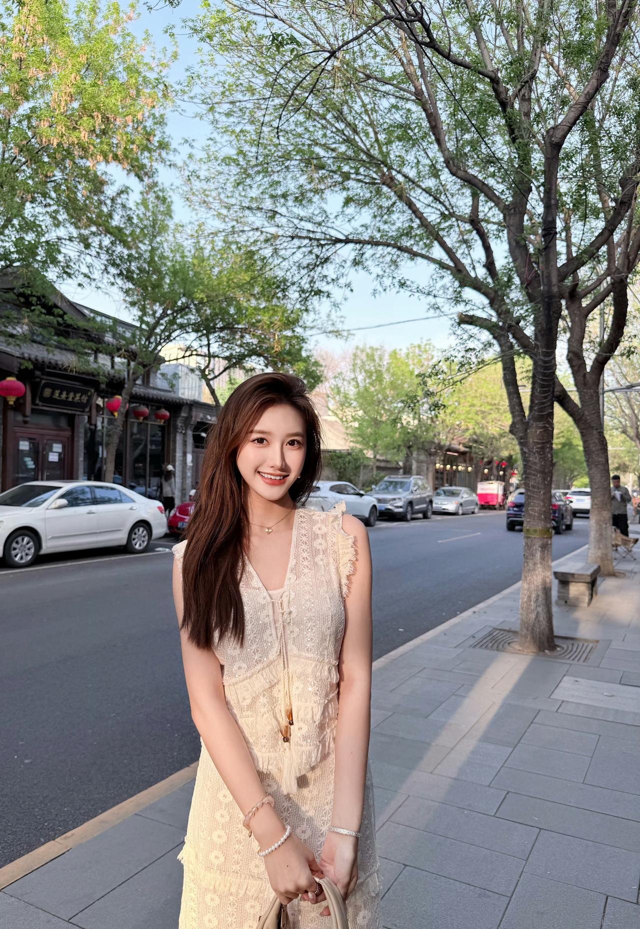 米白蕾丝裹着松弛感,老巷的砖、街边的树,都成了温柔的注脚。