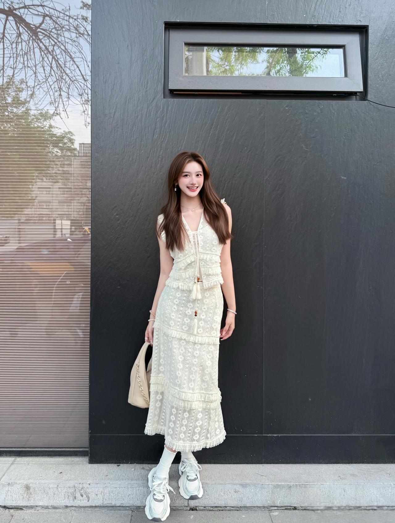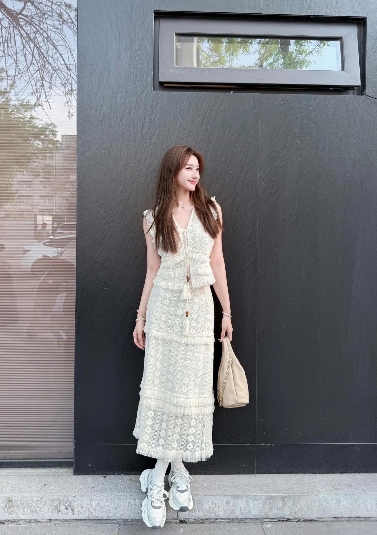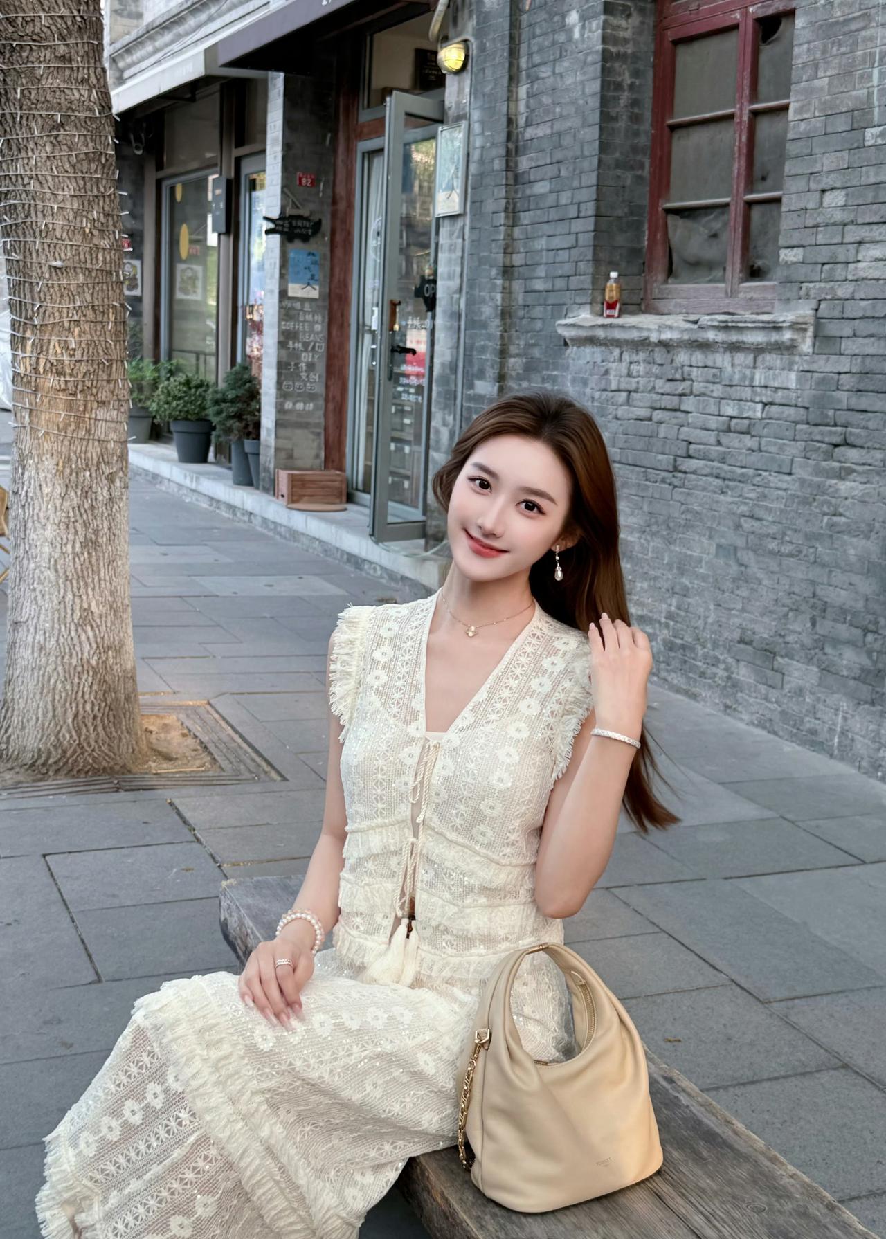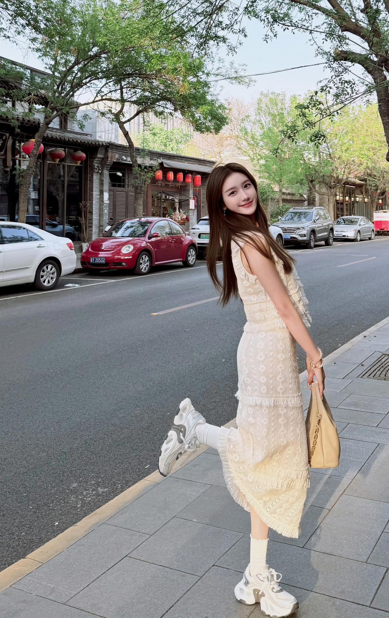 米白蕾丝裹着松弛感,老巷的砖、街边的树,都成了温柔的注脚。 不必追赶时间,只在