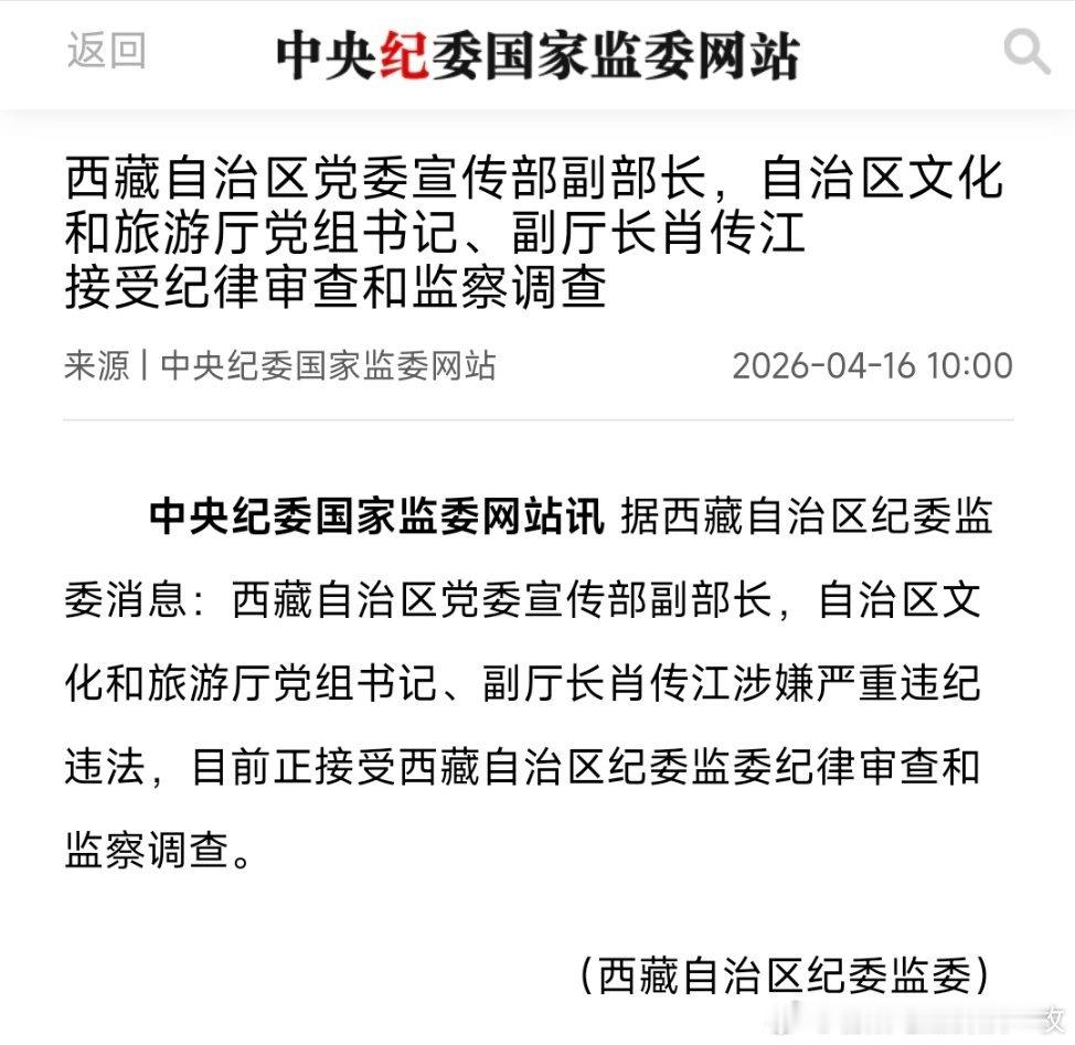 西藏自治区党委宣传部副部长,自治区文化和旅游厅党组书记、副厅长肖传江接受纪律审查和监察调查!