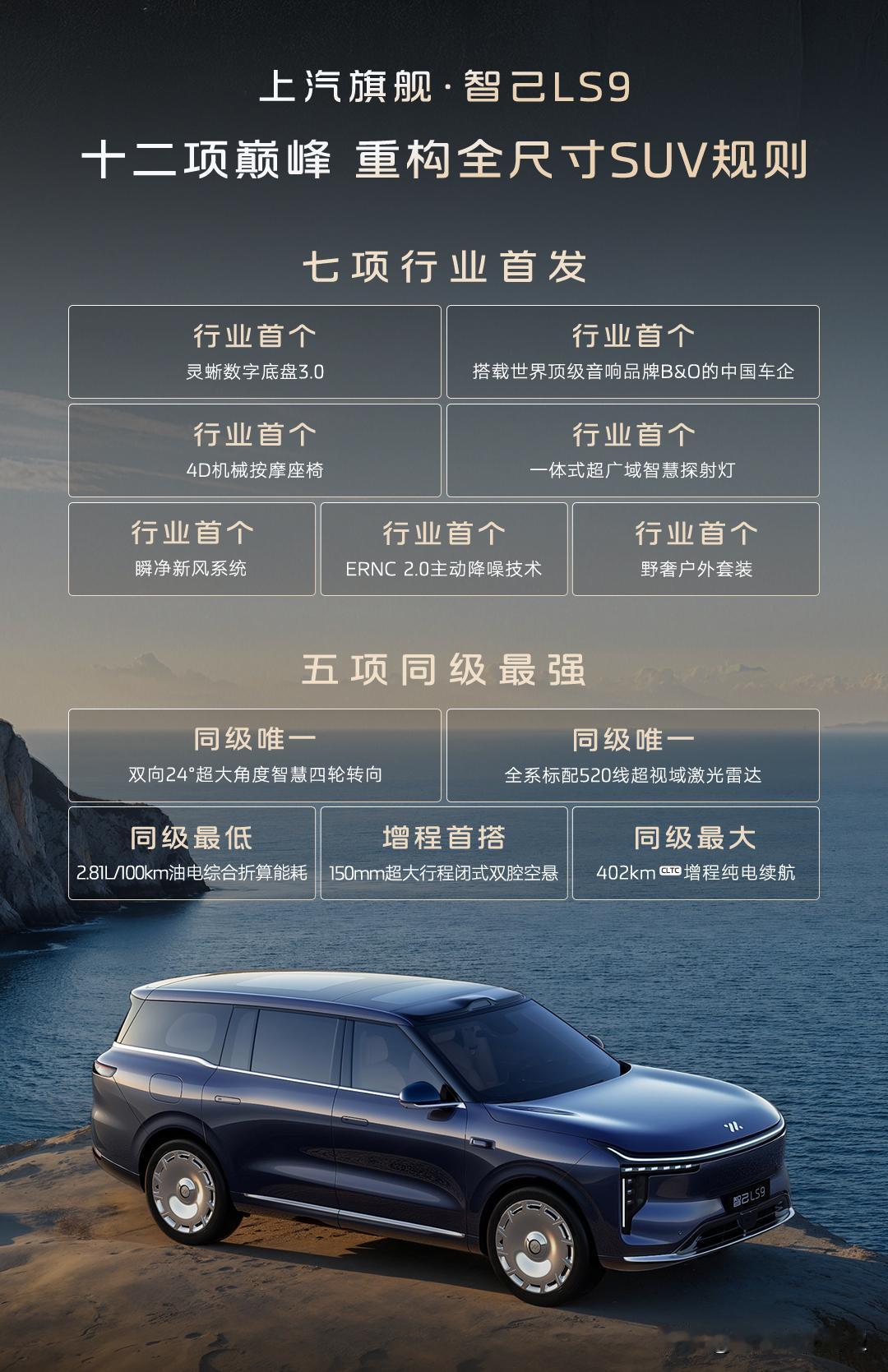 智己的技术红利还将持续释放——备受关注的上汽旗舰车型智己LS9,将于11月4日正式开启预售。作为智己品牌冲击高端市场的旗舰力作,LS9堪称“技术集大成者”,LS9将深度集成上汽集团最新核心技术成果。例如其首发搭载的第三代线控底盘与双向24°后轮转向系统,将彻底颠覆人们对5.2米级全尺寸SUV的操控认知,让大型SUV同时兼具小型车的灵活与豪华车的稳定。在豪华配置方面,新车配备的4D机械按摩座椅、B&O高端音响系统等配置,进一步拉满出行的豪华质感。