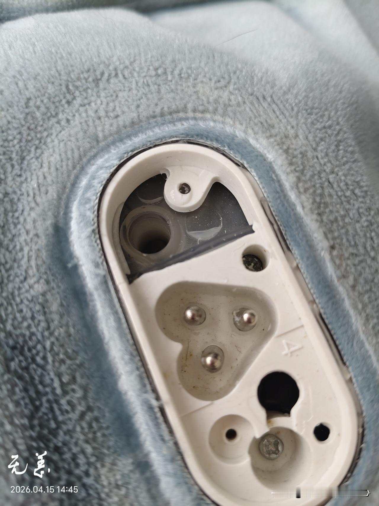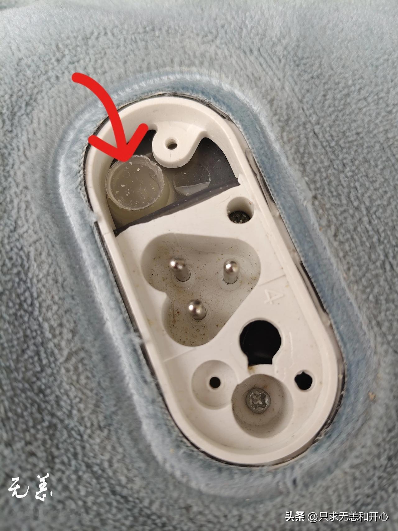[微风]接下来修理短的那个,同样的步骤,拆掉外边充电板,里边有一个塑料塞子,拔掉它以后就能看到里边的水,轻轻的把气体排出来,不小心还洒了一点点水。