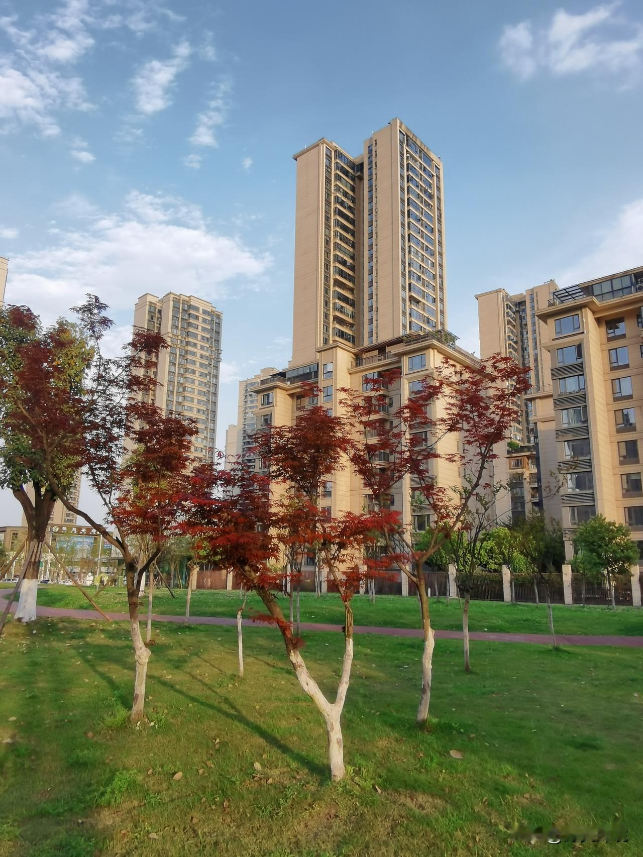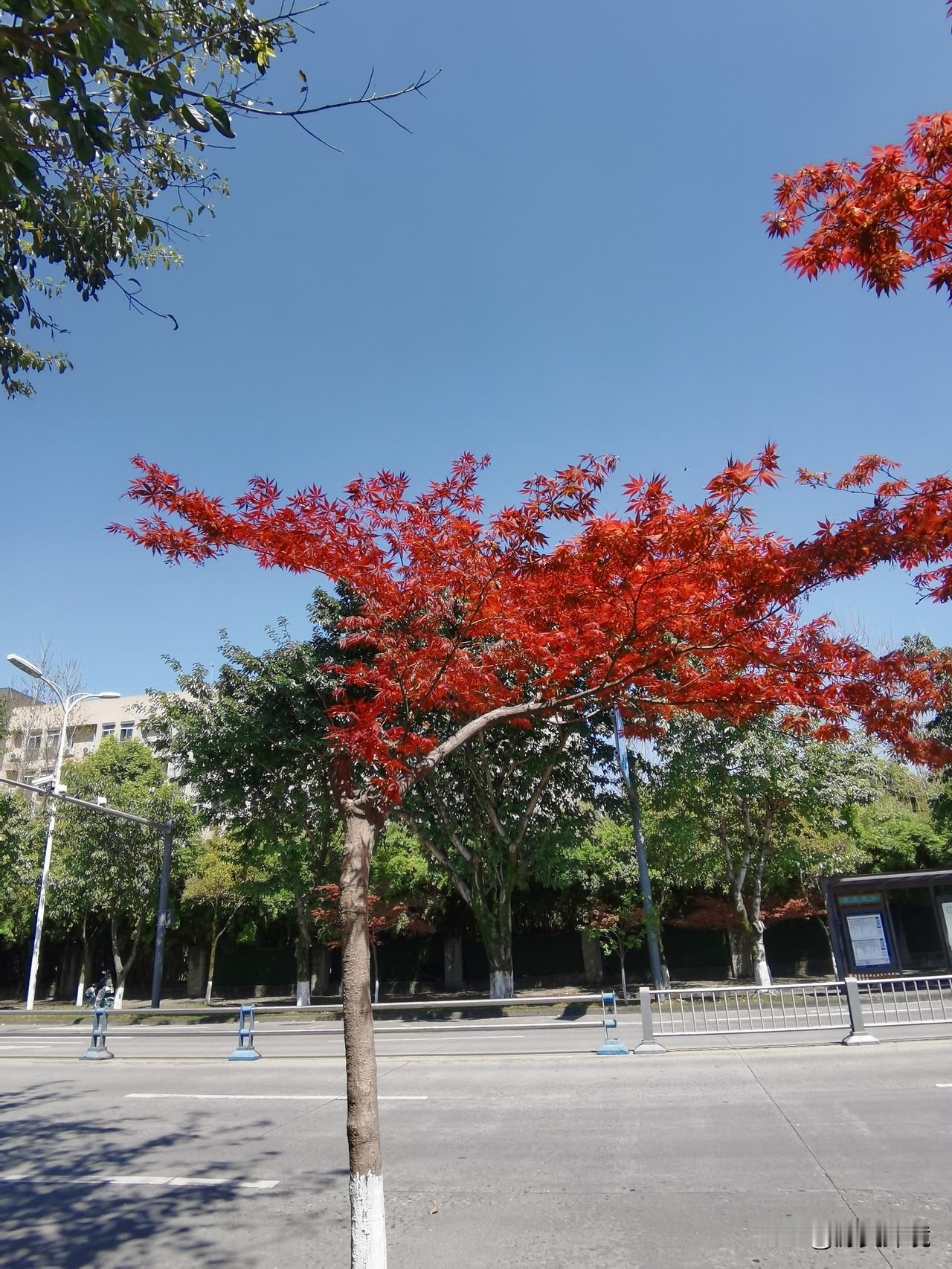 在都市里邂逅初夏的红叶。那红叶在一片翠绿中格外显眼,像是绿毯上的红宝石。