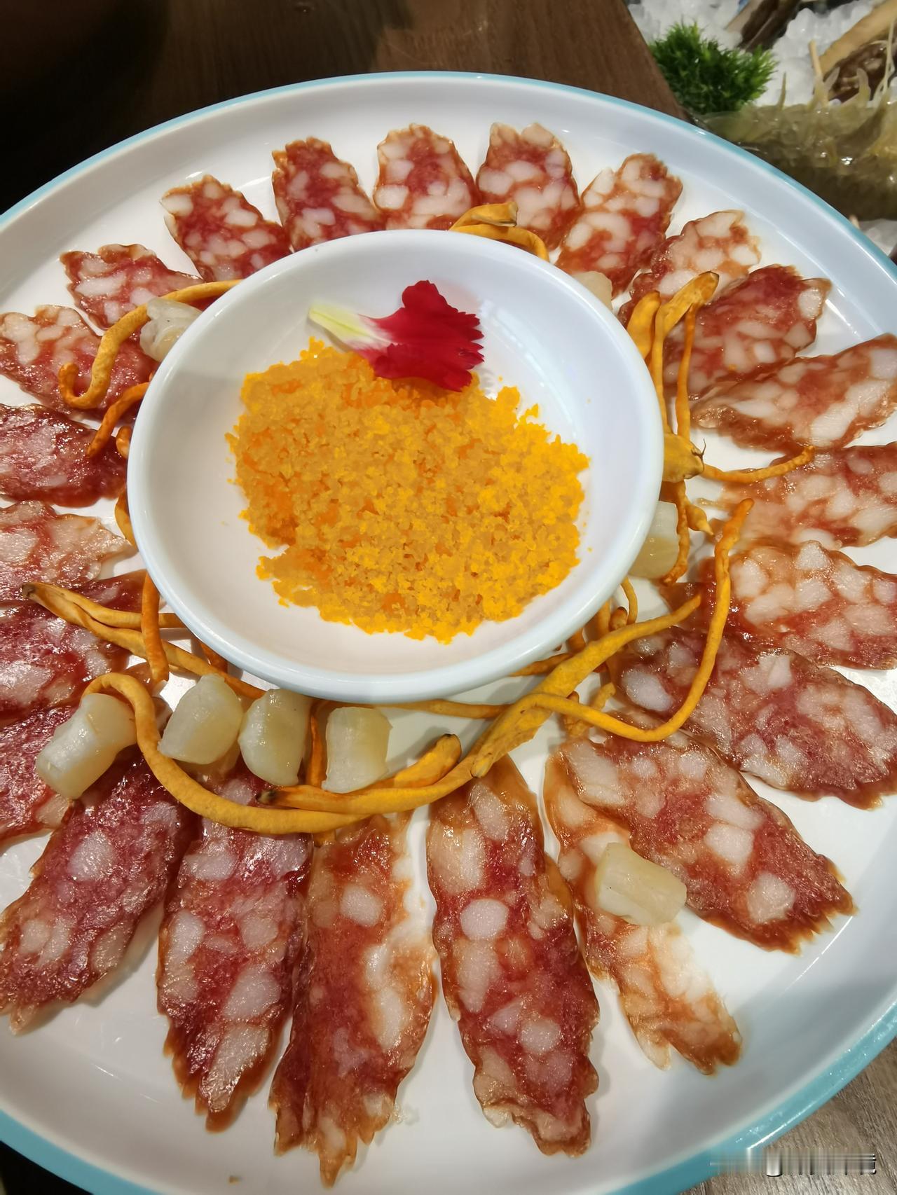 喝粥必备咸香四宝——香肠、虫草花、瑶柱和咸蛋黄。