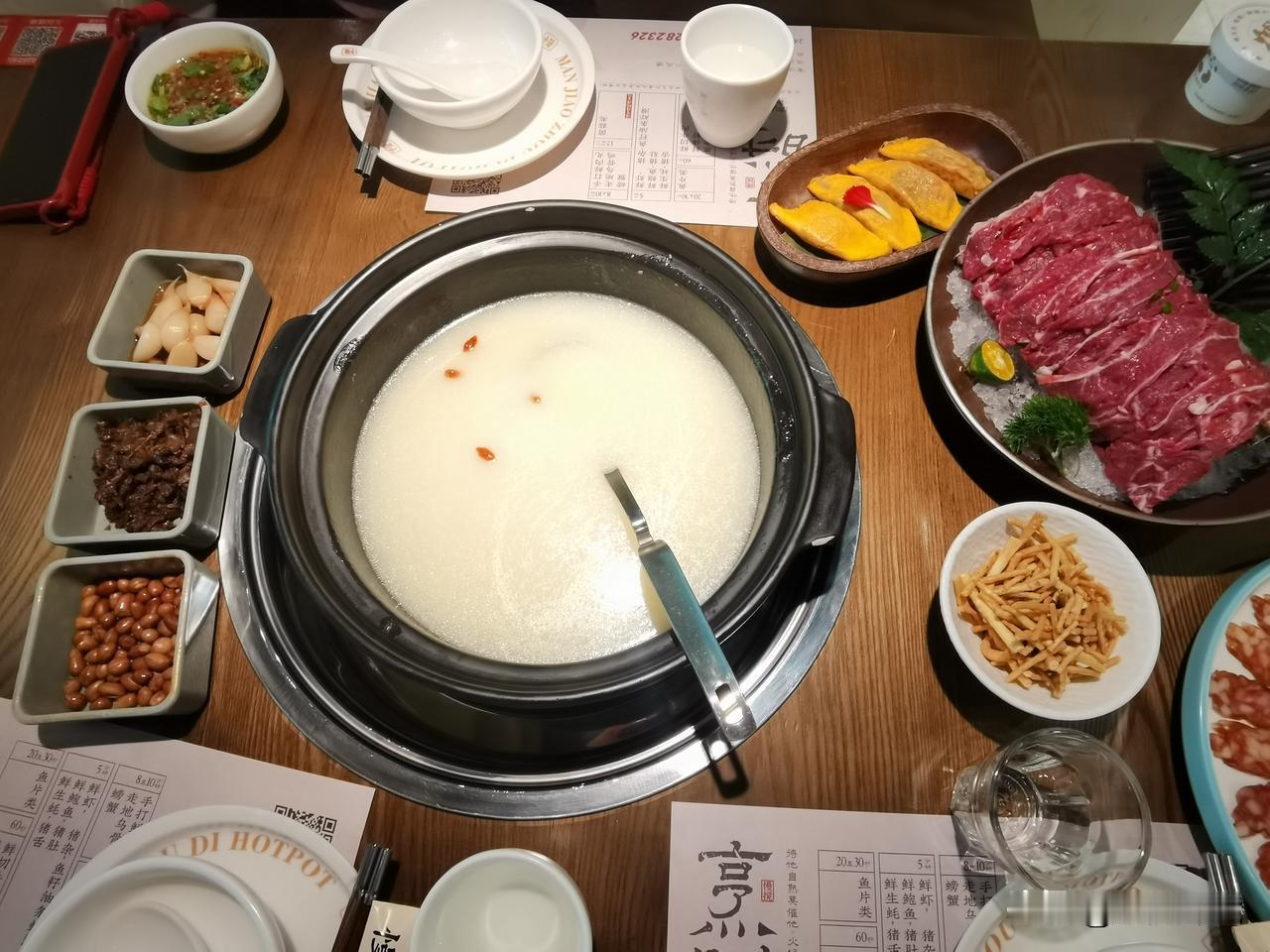 晚餐时分,我在温江合生汇四楼的慢搅粥底火锅餐厅就餐。点了大骨老汤粥底锅,还有可随心搭配的海鲜拼盘,里面有活虾、鲍鱼、生蚝,以及屠场鲜切的牛肉吊龙、霸王蟹柳、手作牛肉蛋饺和手打猪肉丸。
