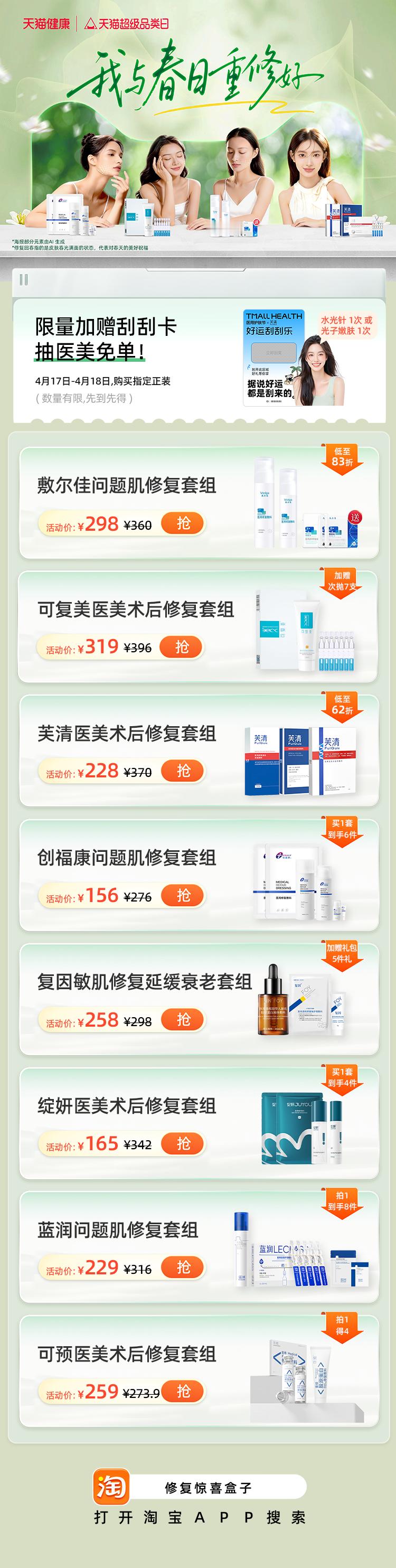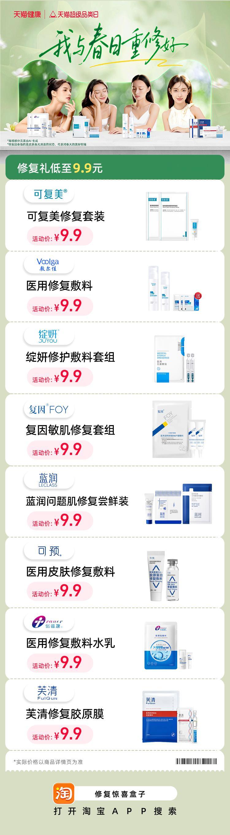 春天出去野固然开心,但风吹日晒后的皮肤状态也真的很让人心疼。比起大浓妆,最近我更迷恋那种皮肤透出来的健康光泽~ 淘宝对天猫过敏天猫品类日上线啦,9.9元就能入手价值80-120元的修复礼,缓解肌肤小情绪刚刚好✨。下单指定款还有医美刮刮卡可以抽,这两天中奖率更高哦~换季过敏修复全靠它了 戳【网页链接】库存有限先到先得。给肌肤一份换季专属关怀吧~