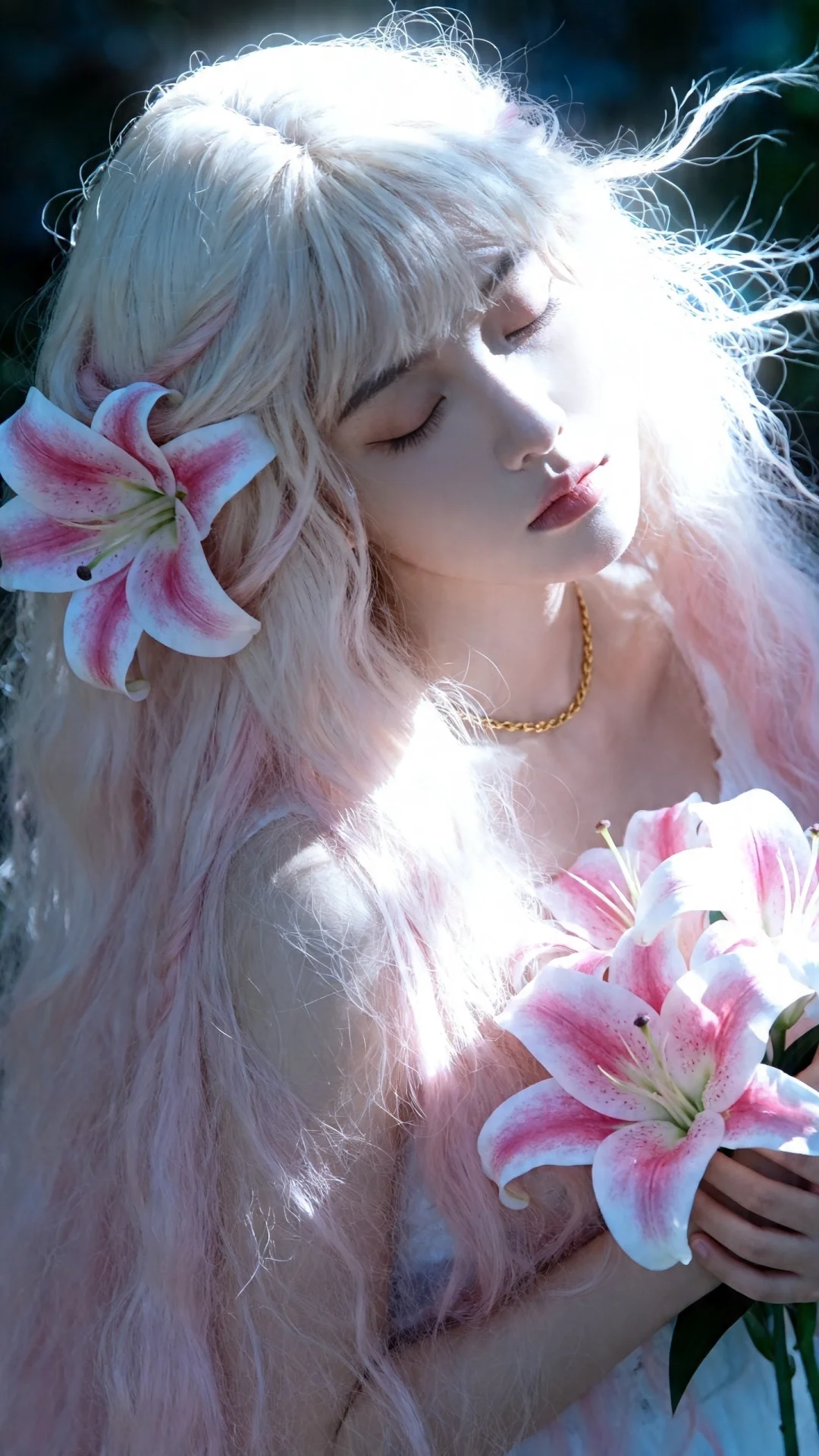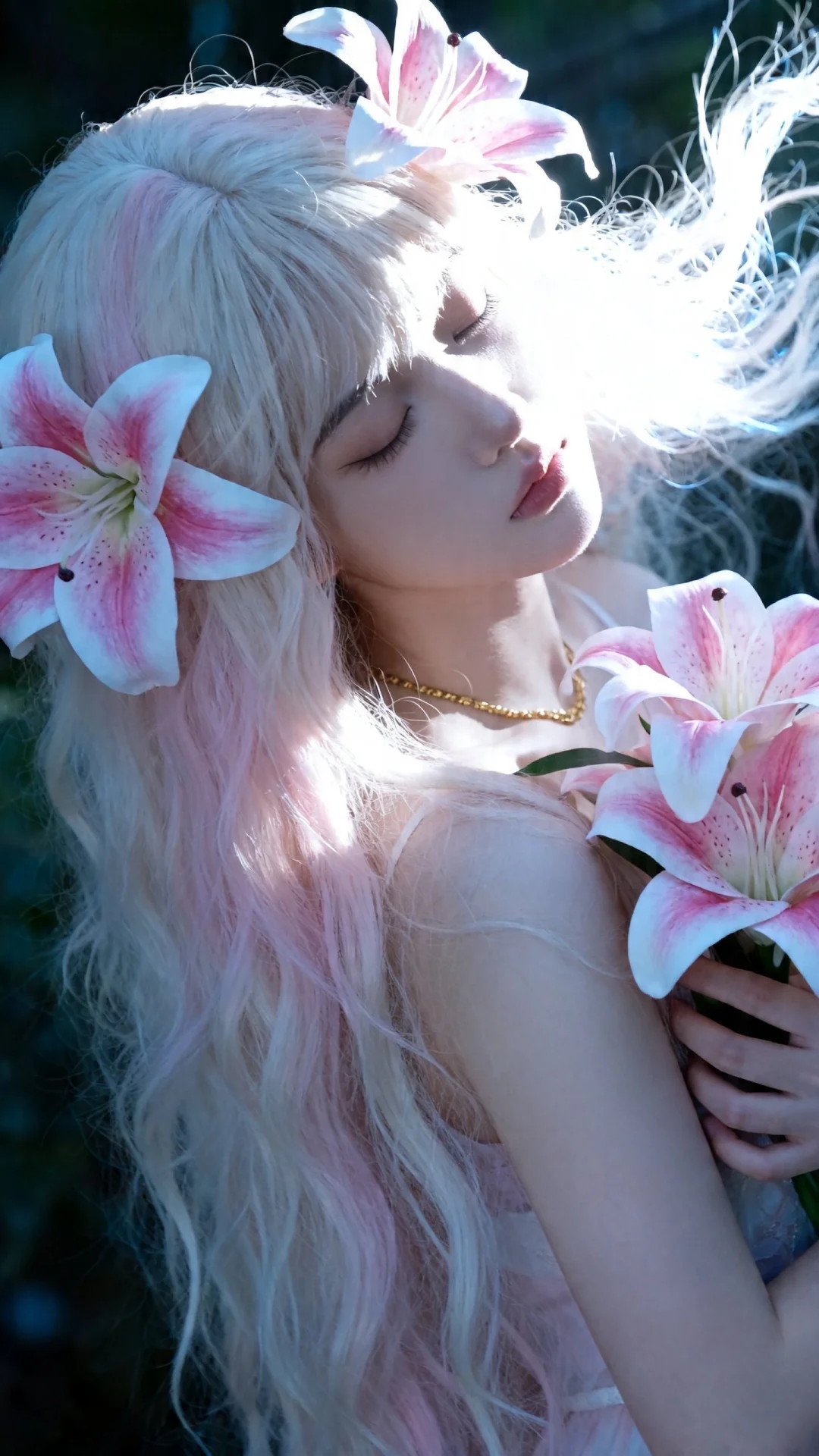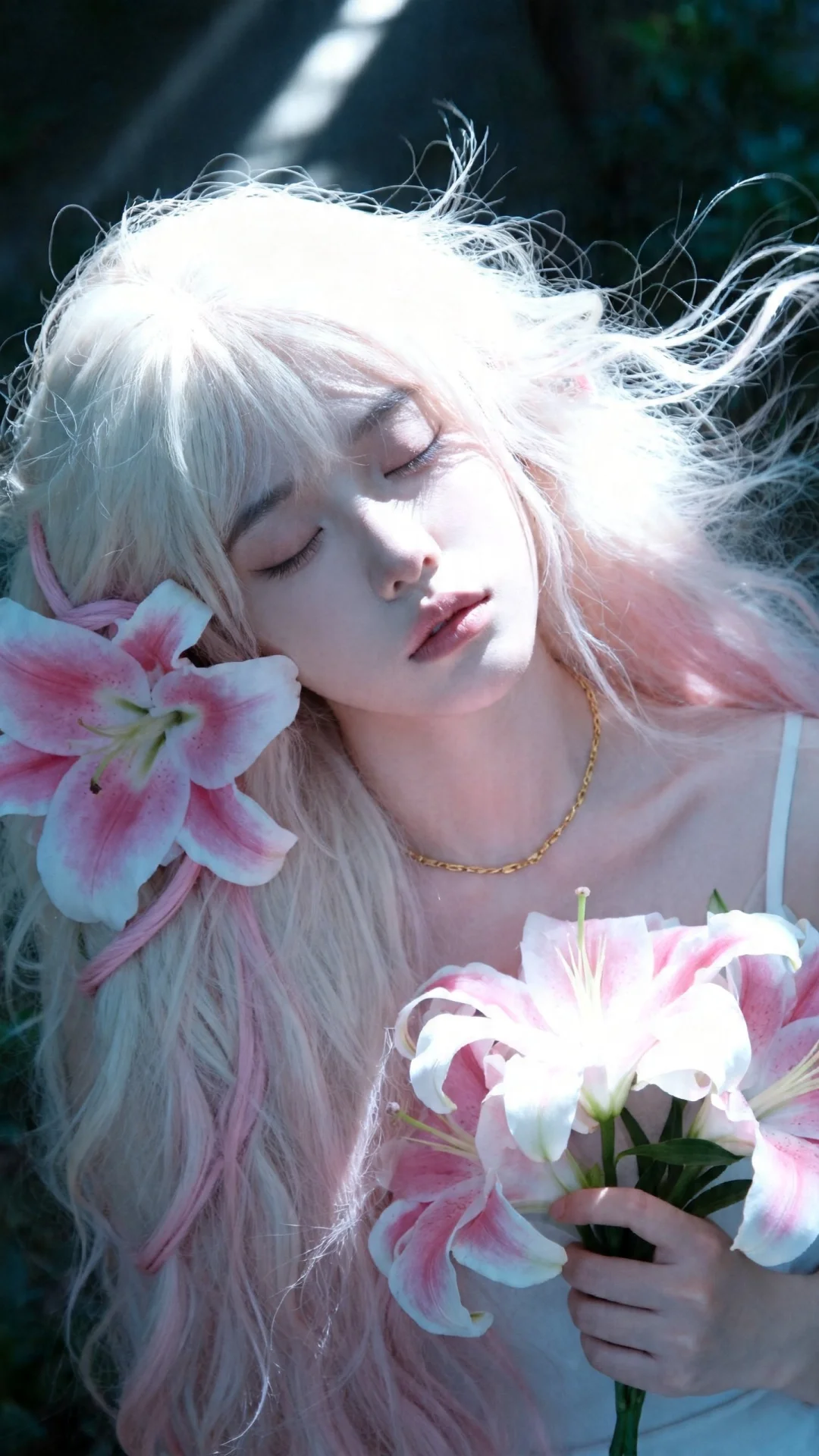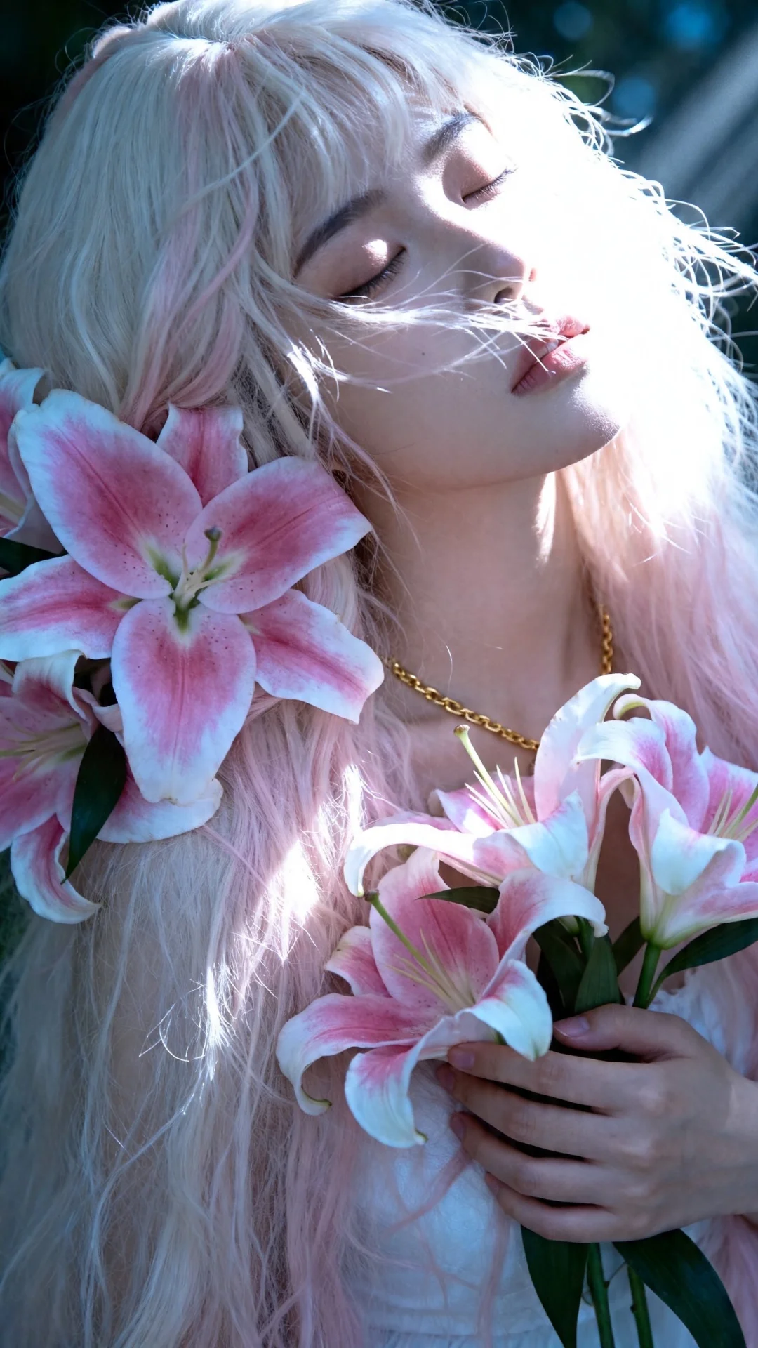一位长发及腰可爱的女生。构图随意却尽显生活中的绚丽日常,人像摄影,日常快照风格,非精心构图或打光,以日系少女写真的风格呈现,略微俯视角度,质感光照搭配自然光线,构图随意却尽显生活中的绚丽日常,姿态自然随性,半身特写,非对称构图,主体偏画面右侧,鹅蛋脸少女,清冷纯欲风。面部双眼轻闭,表情慵懒又忧郁,面部光影层次丰富。淡粉奶白色长发,蓬松凌乱且飘,秀发上缠绕大朵粉白渐变的曼陀罗花。手捧粉白渐变花卉,手指纤细,脖颈处有金色细链点缀,露出的肌肤冷白皮,自带清透柔光,一束强烈的冷色逆光从侧上方斜打下来,有丁达尔效应。整体冷色调为主,高对比光影,梦幻写实风,唯美奇幻,人像摄影,艺术感拉满。