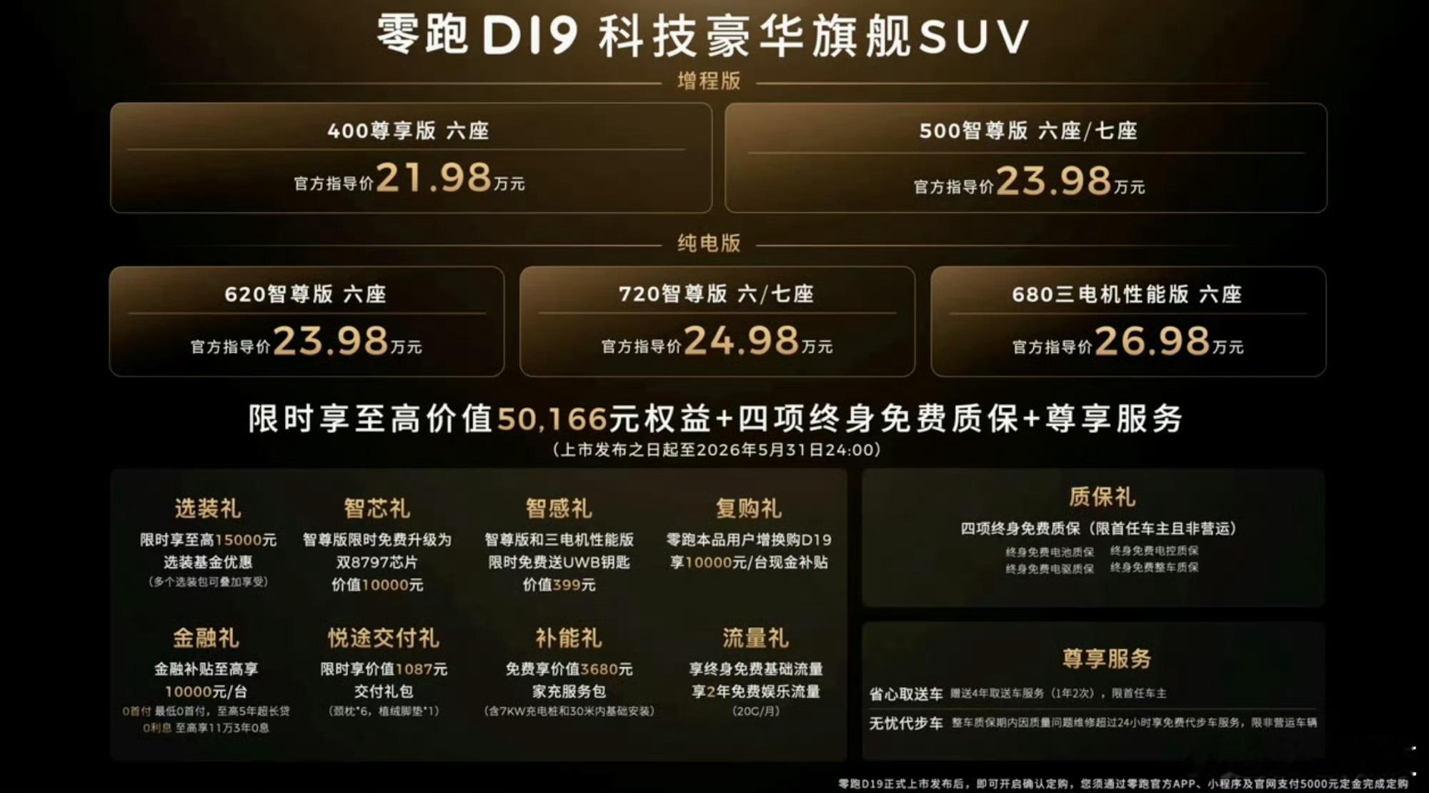 零跑D19零跑最近推出的 D19 是一款全尺寸旗舰 SUV,车长超过 5.2 米,轴距达到 3.11 米。关键是它提供 6 座和 7 座可选,恰好切中了许多家庭用户对“大空间”的刚需,