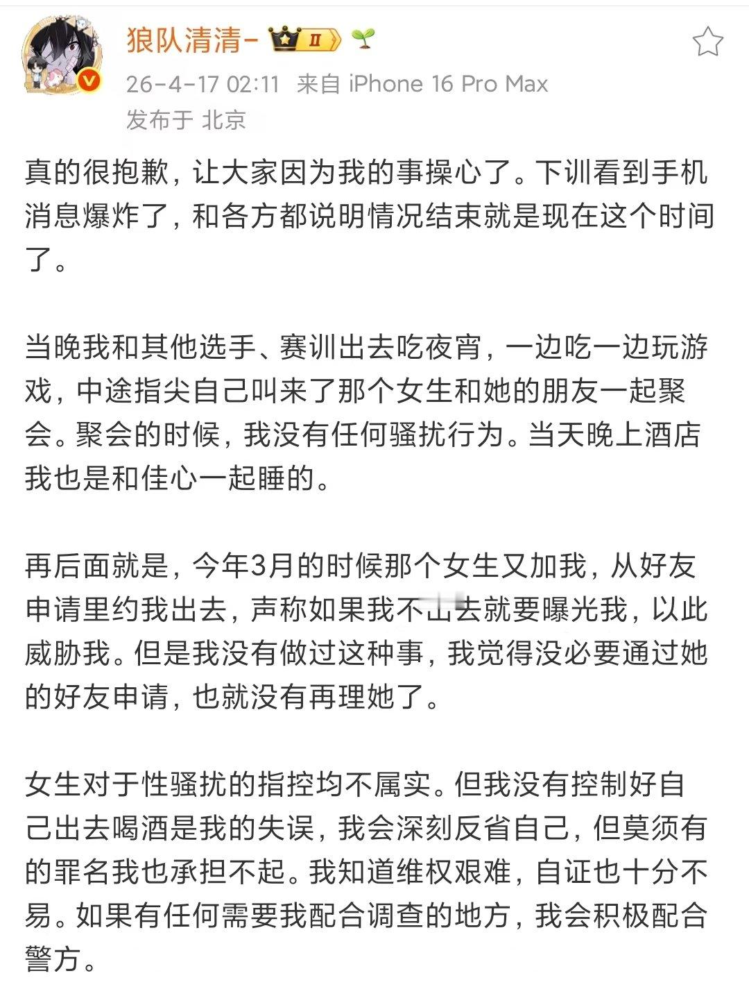 狼队否认清清性骚扰清清长文回应清清长文回应,哎呀我滴妈