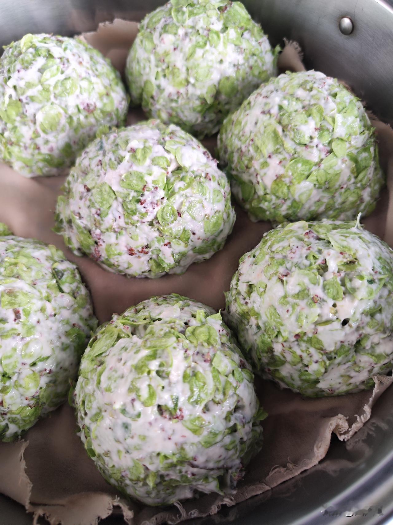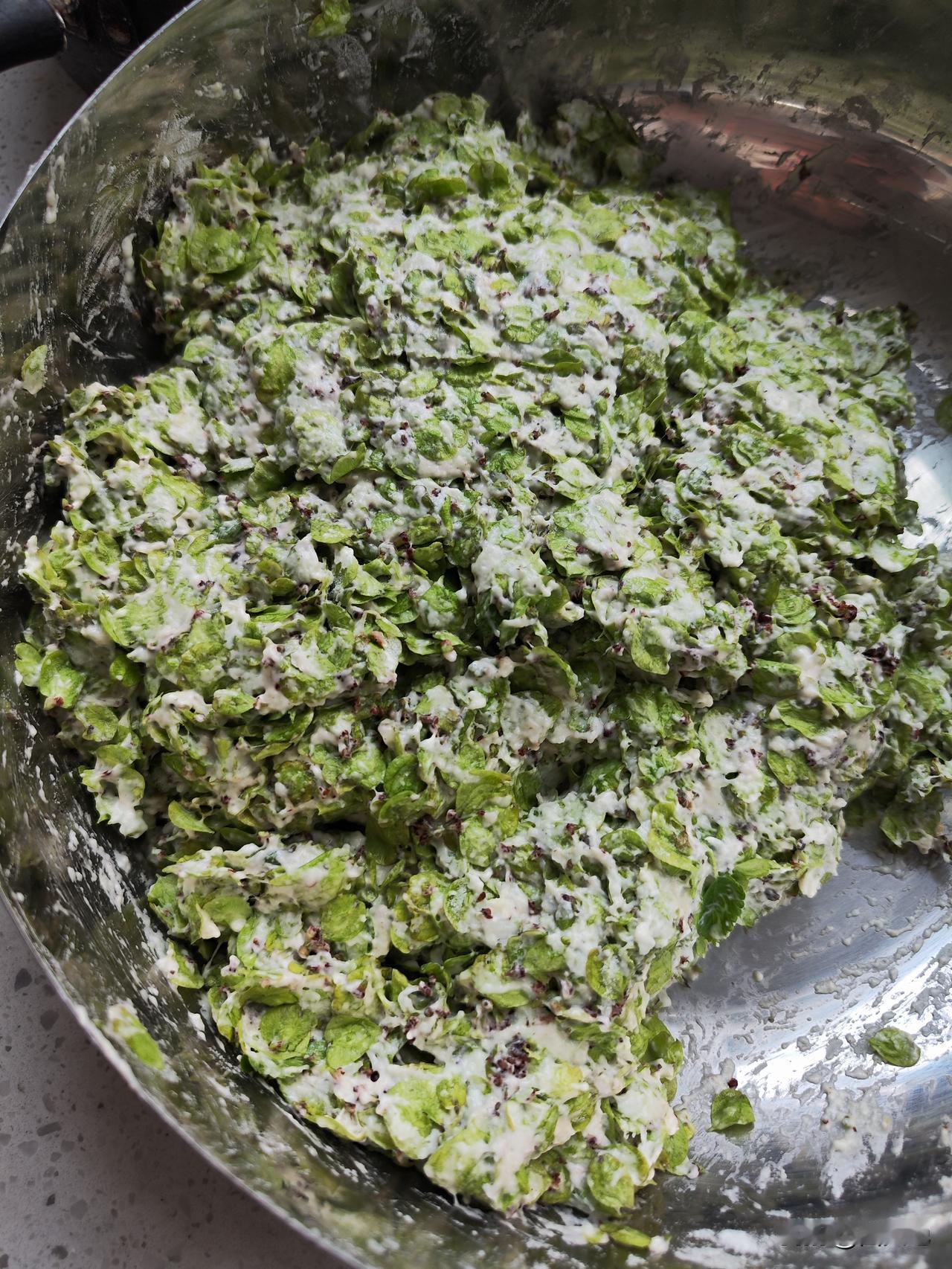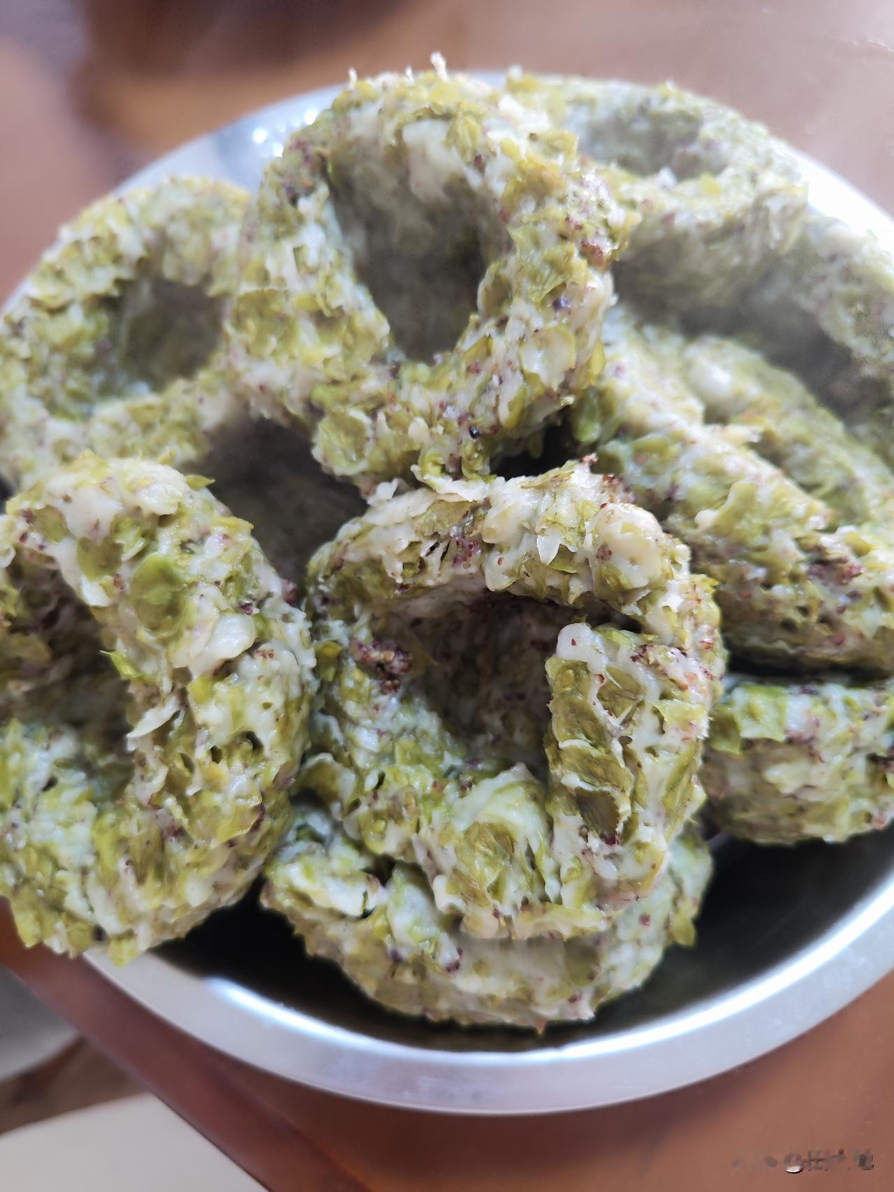 采摘的榆钱清洗干净,控干水分放面盆,加两匙面粉,少许食盐和十三香,加水搅拌成面团,将面团分成若干面剂子,左手握住面团,右手母指与食指旋转面团,按压成窝窝头,放蒸锅中,开锅20分钟就熟了。
