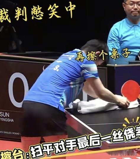 莎莎的毛巾可是万能的,她的脸和球拍可是一个待遇呀!擦完桌子在擦脸,擦完脸在擦球拍,擦脖子,擦胳膊,莎莎的毛巾是国乒神器吗?