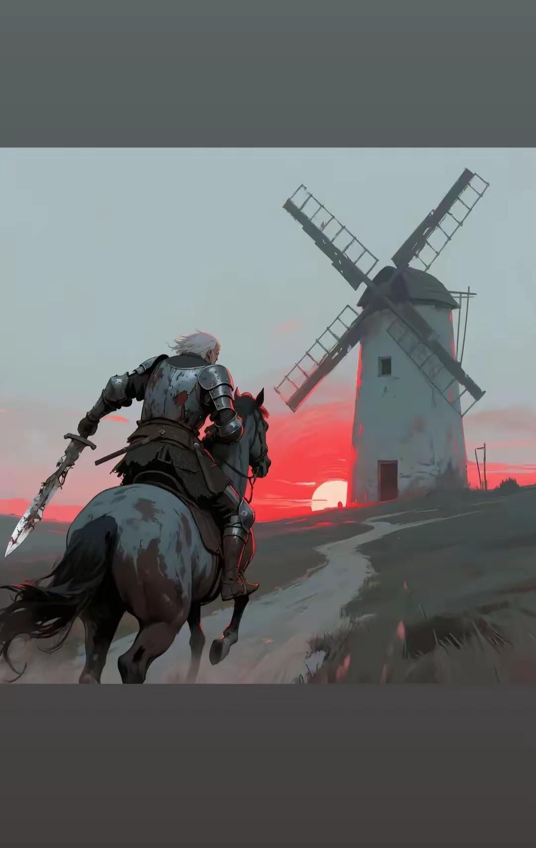 在堂吉诃德的世界里:他骑着战马,手握长枪,像一个骑士一样冲锋。
