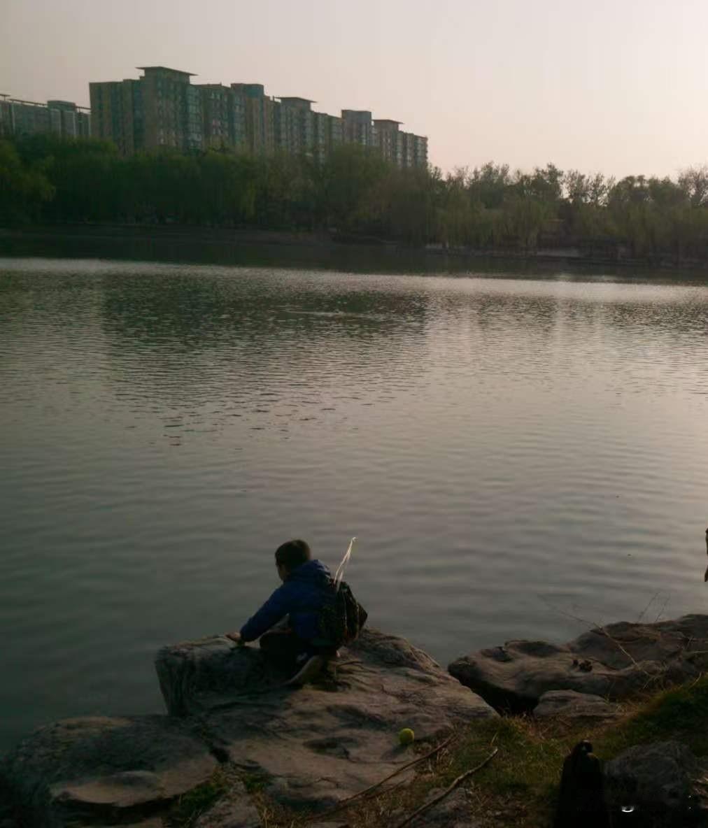 小童看景蹲岸头。