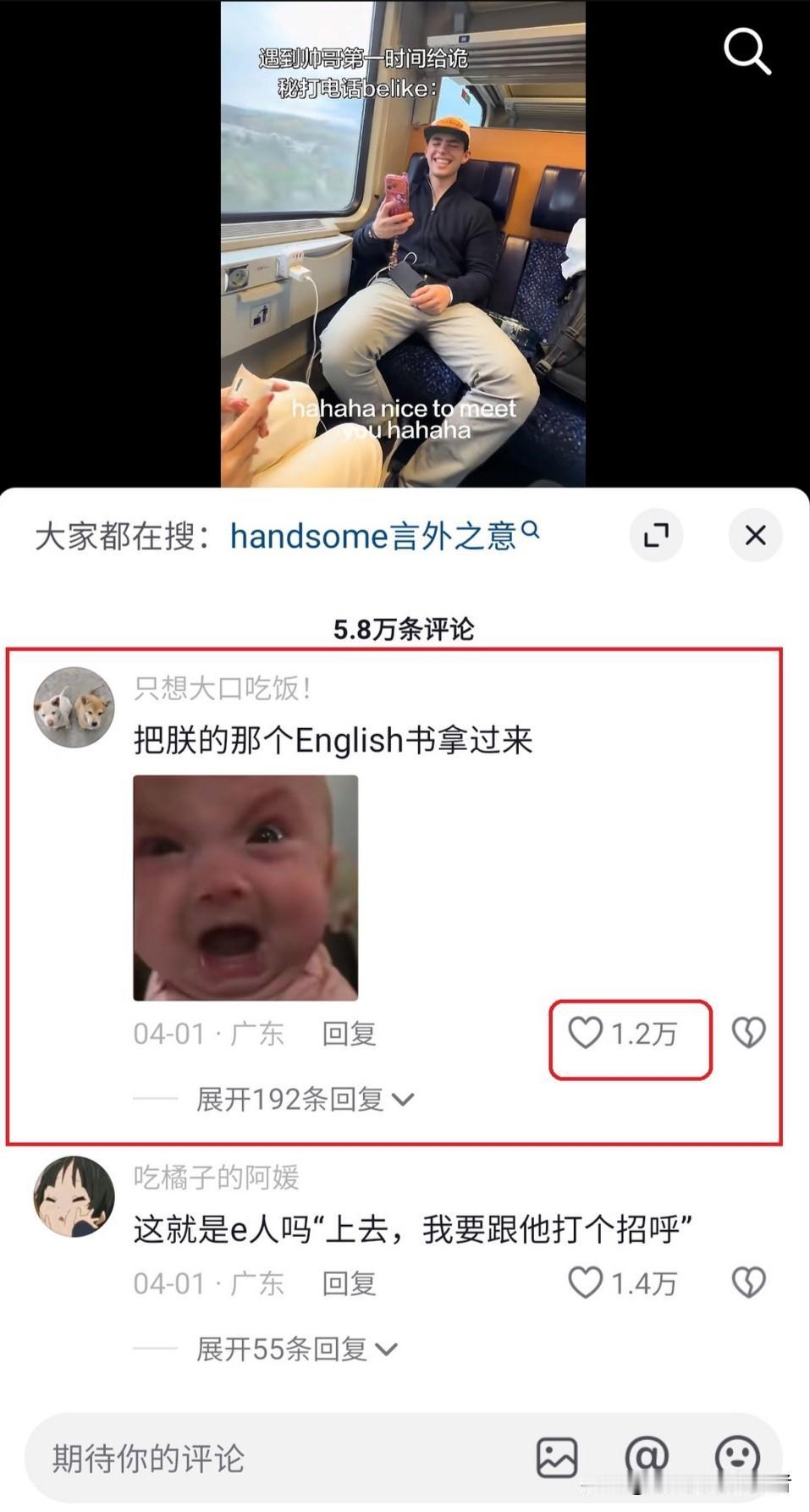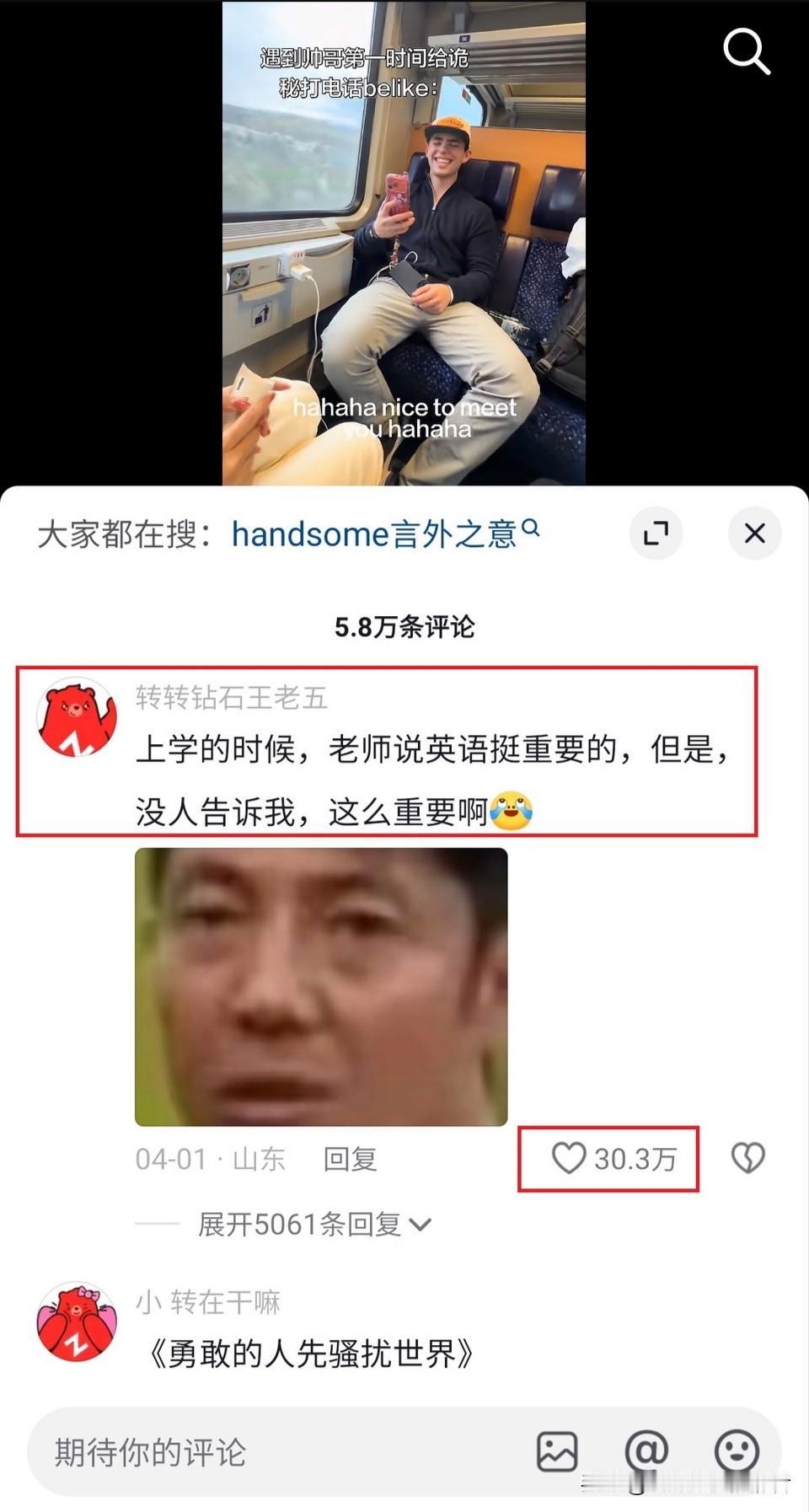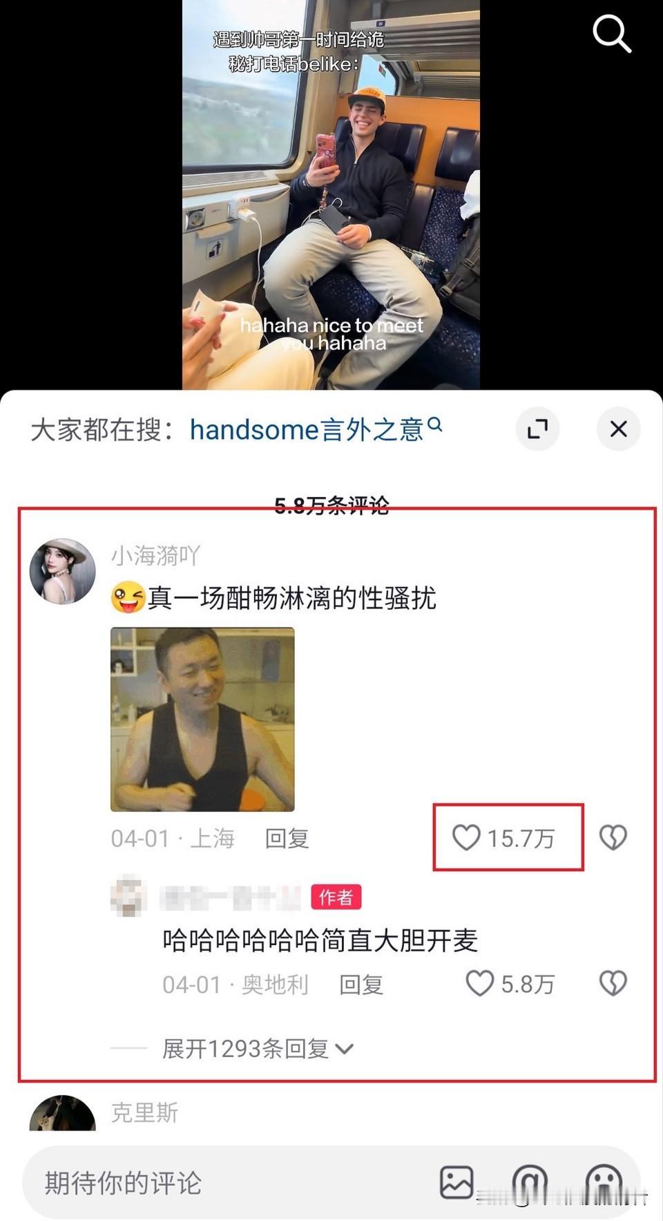 这个视频的评论区更有意思。这个视频几乎都是年轻中国女性在评论,她们的意思基本上都是“勇敢的人先享受世界”,“中国女性要勇敢地去主动搭讪外国帅哥”,”中国女性要勇敢地'骚扰'外国帅哥(她们口中的‘骚扰’是褒义词,因为视频里的白男帅哥没有反对,反而很配合她们)“。