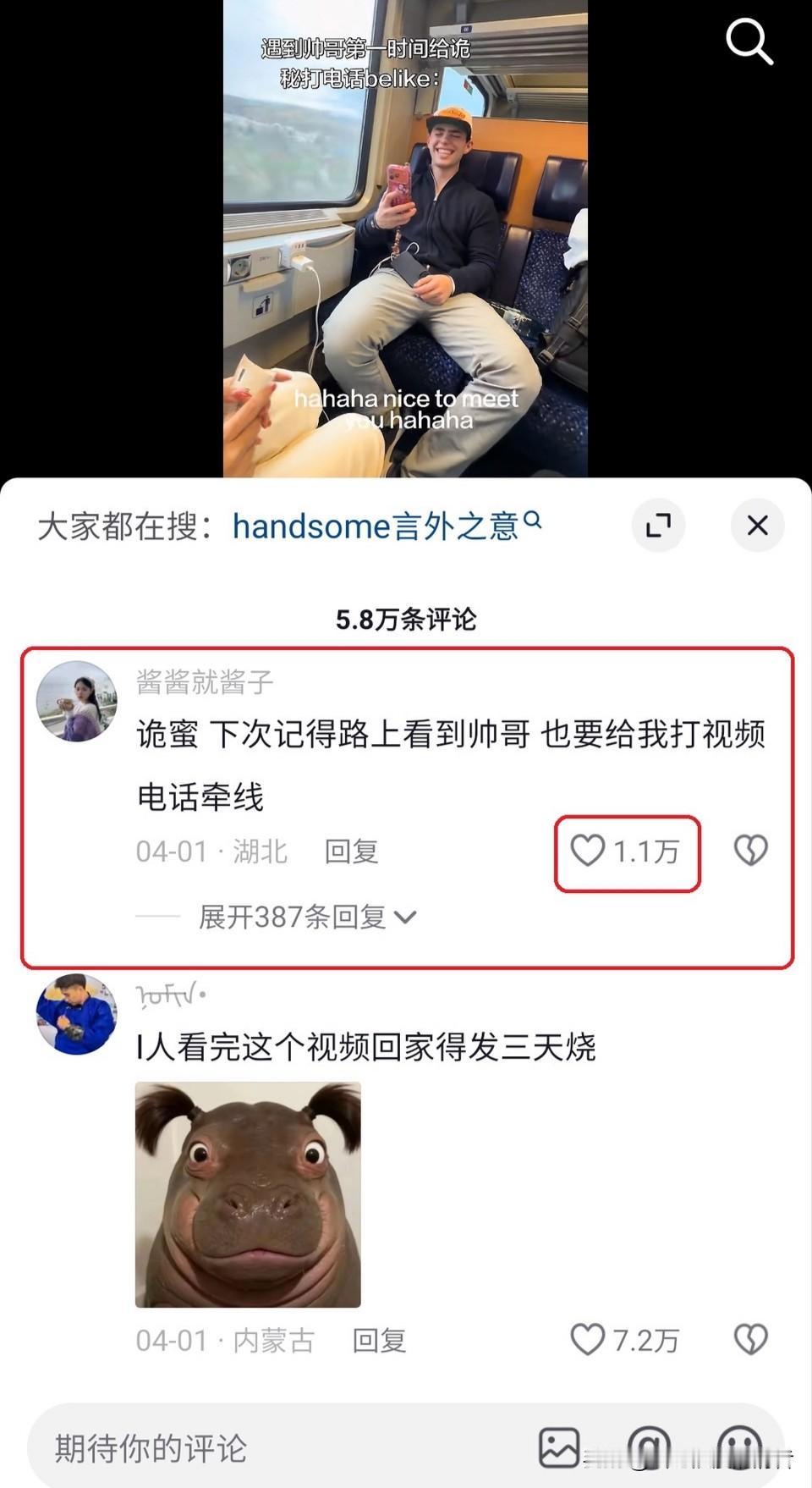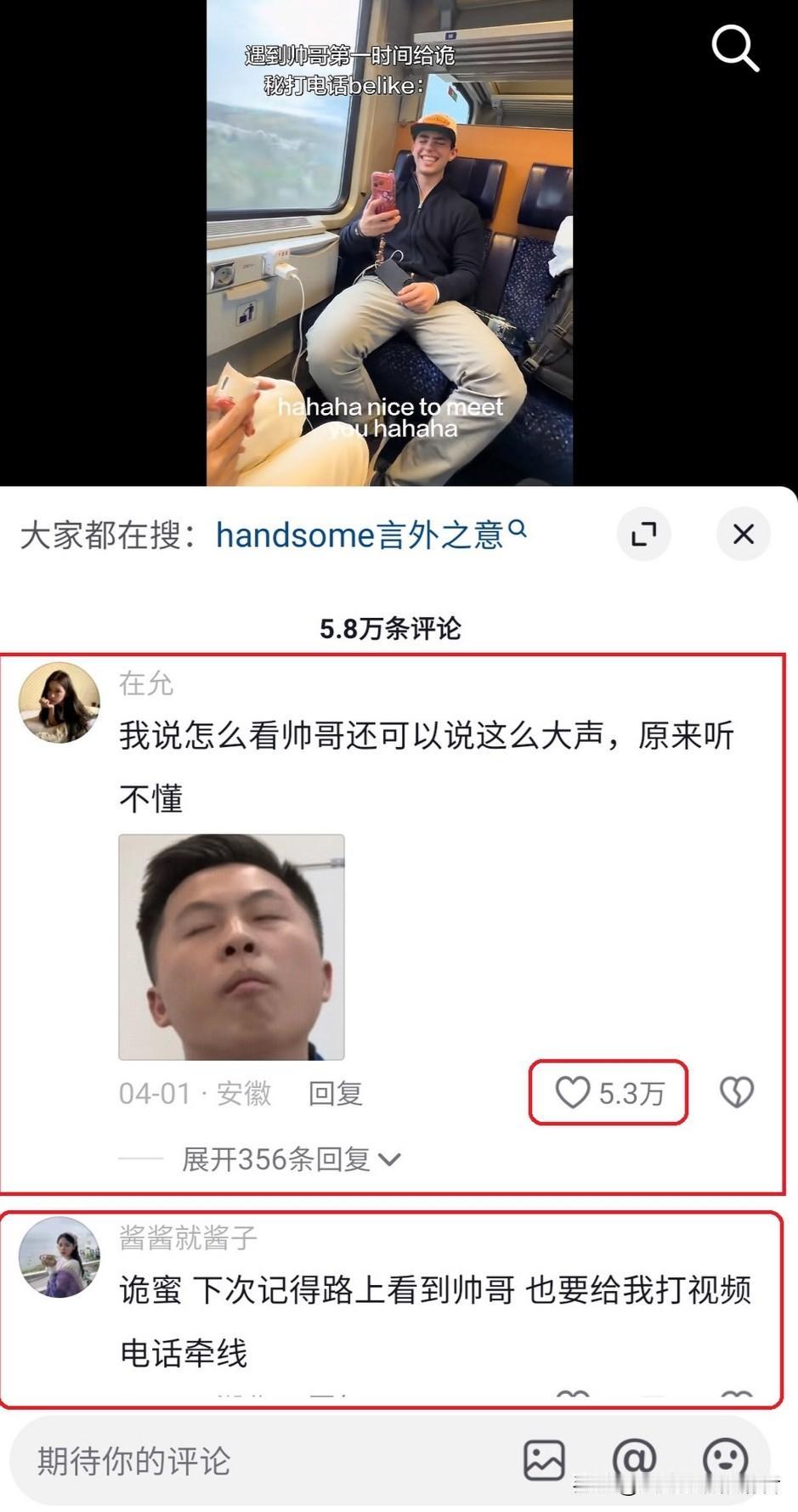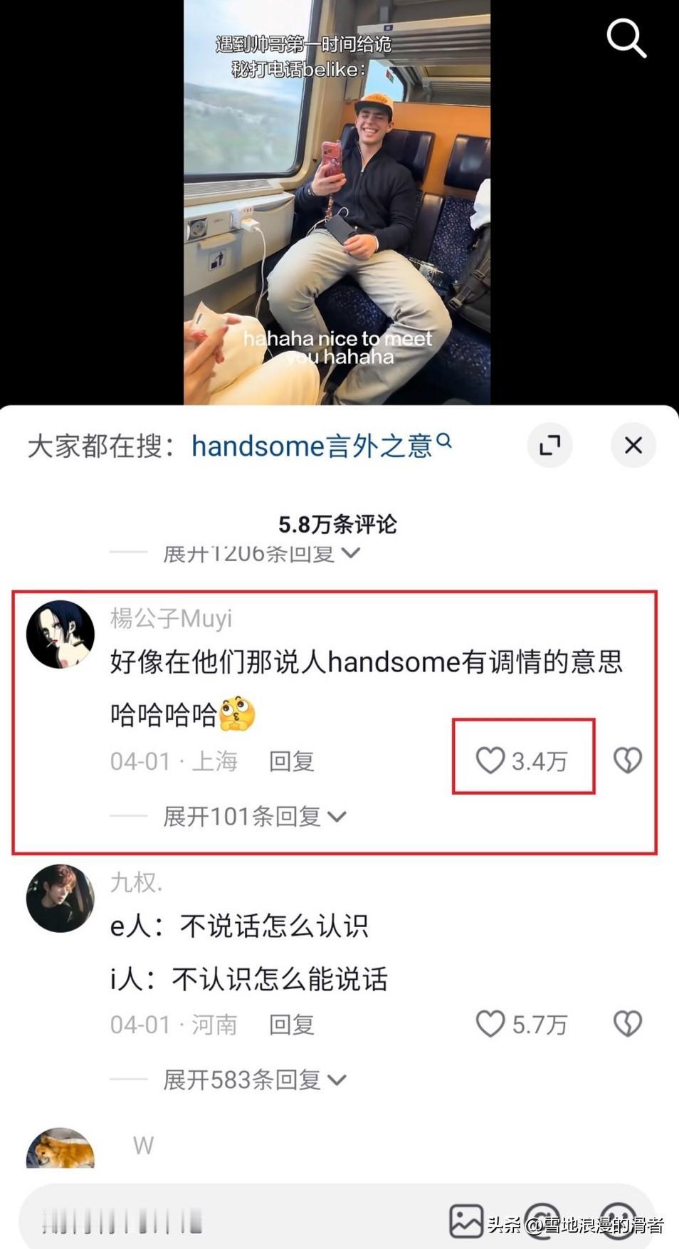 这个视频是一个中国美女博主,在地铁上看到一个陌生白男帅哥,并主动搭讪白男帅哥,还直接给闺蜜打视频电话,给闺蜜直接视频推送这个白男帅哥,让闺蜜主动跟这个陌生的白男帅哥聊天,跟白男帅哥主动、直接地搭讪,说“you are so handsome!(你长得好帅)”之类的男女异性之间的话。按评论区的话来说,就是“中国女生把这个陌生的白男帅哥钓成翘嘴了”