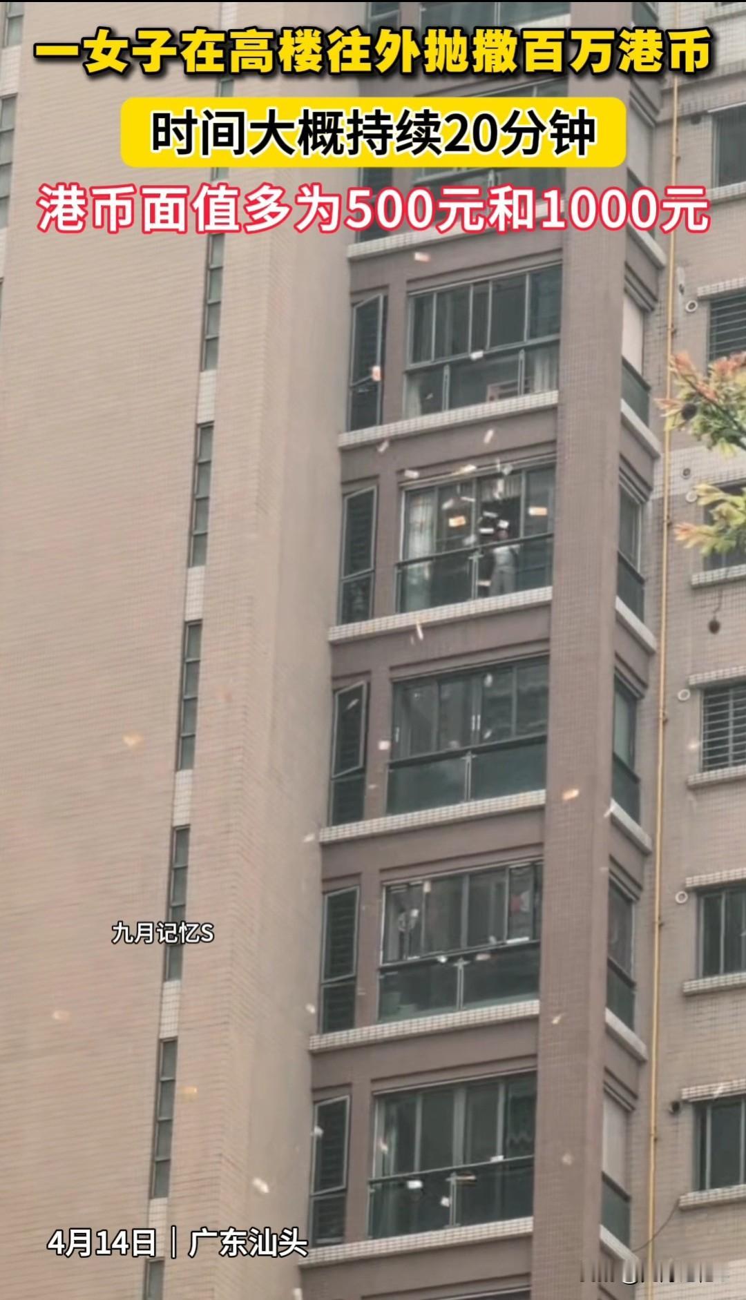 4月14日,汕头星湖城小区一女子狂撒百万港币。路过行人被漫天飞舞的钞票吸引,纷纷停下脚步。