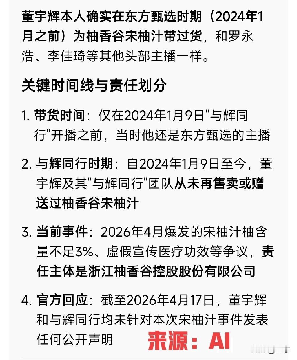 - 2024年1月9日至今:董宇辉及其与辉同行团队,从未在任何一场直播中售卖、赠送过任何版本的柚香谷产品(可查所有直播回放及商品链接历史)