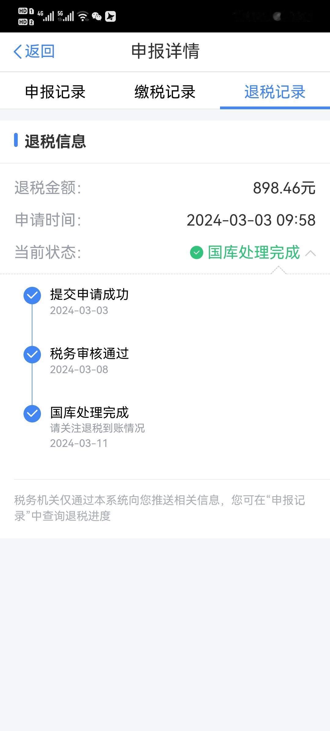 3月4日下午两点半多点申请成功,直至今日3月12日下两点,时间已过去整八天,望穿秋水这个税退费总算进入了最后阶段一一国库处理中……按惯例,也就是说这退费很快就要打入之前绑定的银行卡了。