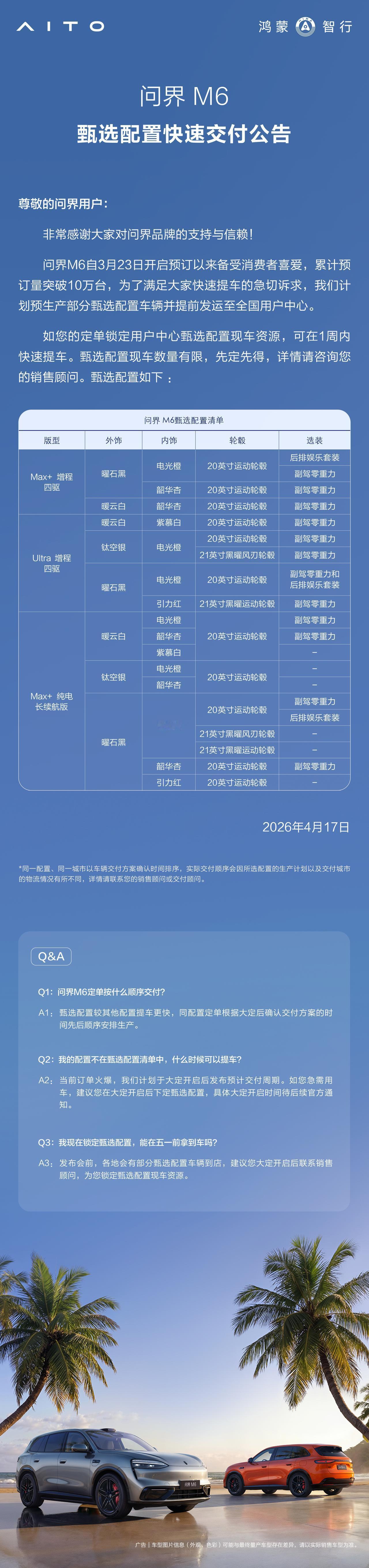问界M6下周正式上市,也会开启交付。 这会官方也给出了甄选配置,最快可以一周提车