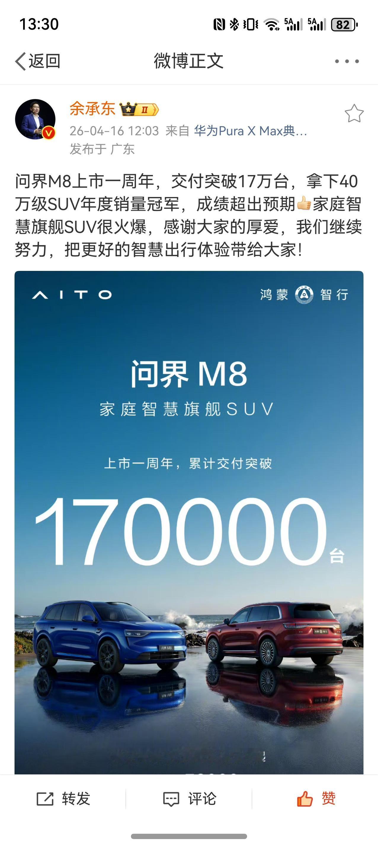 4月16日,余大嘴说问界M8交付量已经超过了17万,而截止3月底的M8总交付数据是16.58万,这说明4月的前半个月M8已经交付了4200台,超过了三月整个月的交付量。