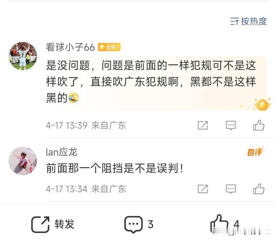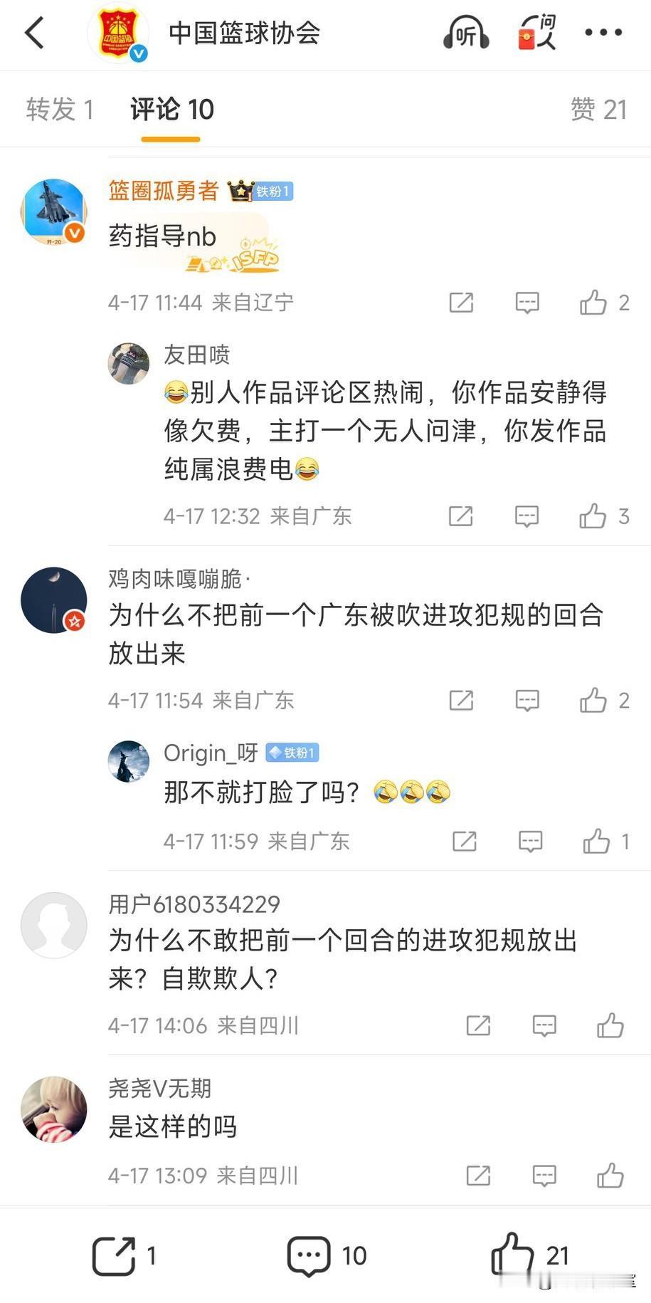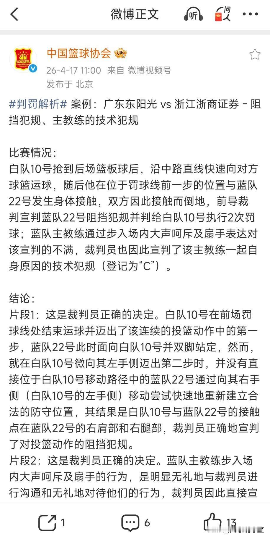 中国篮协官方微博号复盘广东对浙江广厦比赛的裁判判罚,指出麦考尔防守朱俊龙的进攻时被吹阻挡犯规和杜锋对判罚不满对裁判做出无礼的抗议被吹技术犯规都是正确的。不过,广东球迷对此还是意见很大,认同裁判对广东队的这两次判罚,但同时也质疑裁判的吹罚双标,同一场比赛的前一个回合,广厦同样的防守动作,反吹广东的进攻犯规,这就是杜锋对判罚不满吃T的原因,但是,篮协官方并没有拿这个犯规来作分析!