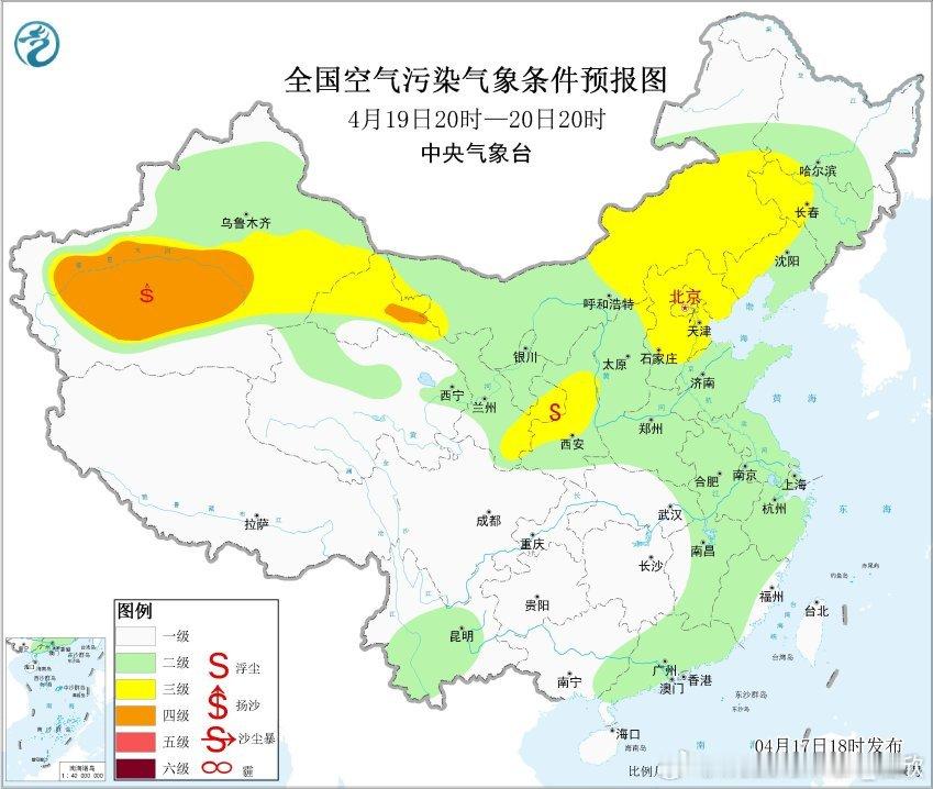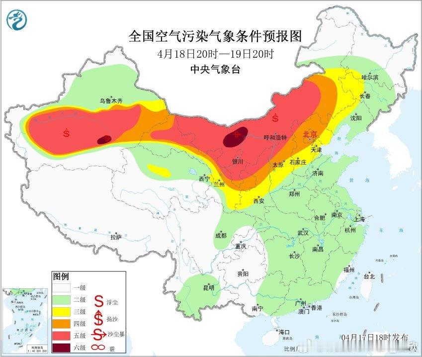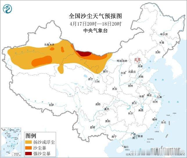 受冷空气大风影响,预计4月17日20时至18日20时,新疆南部和东部、内蒙古西部、甘肃西部、青海西北部等地的部分地区有扬沙或浮尘天气,其中,新疆南部和东部、内蒙古西北部的部分地区有沙尘暴,局地有强沙尘暴。18日晚-20日晨,沙尘可能继续向东向南传输,波及华北、东北西部等地。