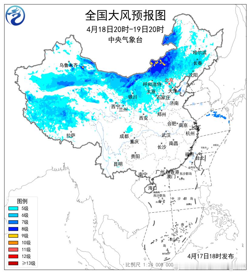 预计,4月18日20时至19日20时,新疆东部和南疆盆地、内蒙古、西藏北部和西部、青海西南部和北部、甘肃北部和东部、宁夏、陕西北部、山西中北部、河北北部、北京西北部、吉林中西部、辽宁中西部等地部分地区有5~7级风,阵风8~9级,其中新疆东北部和南疆盆地、内蒙古中东部等地部分地区有8~9级风,阵风10级以上。
