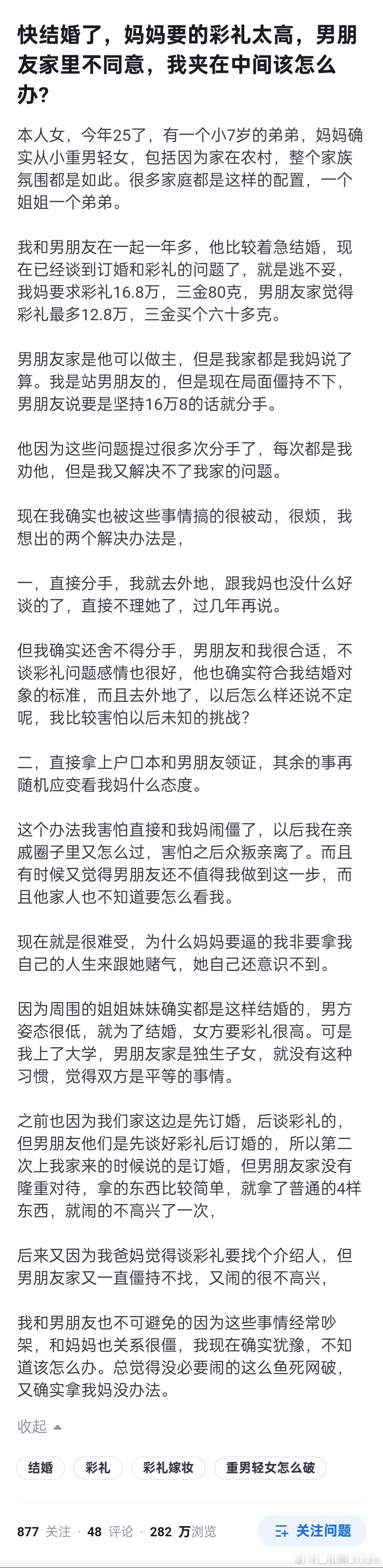 快结婚了,妈妈要的彩礼太高