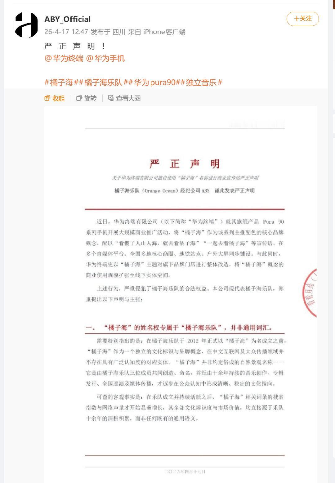 今年华为Pura系列新手机,Pura 90,有个配色叫“橘子海”,被一个叫橘子海乐队的发严正声明,要求华为公开道歉、赔偿损失!