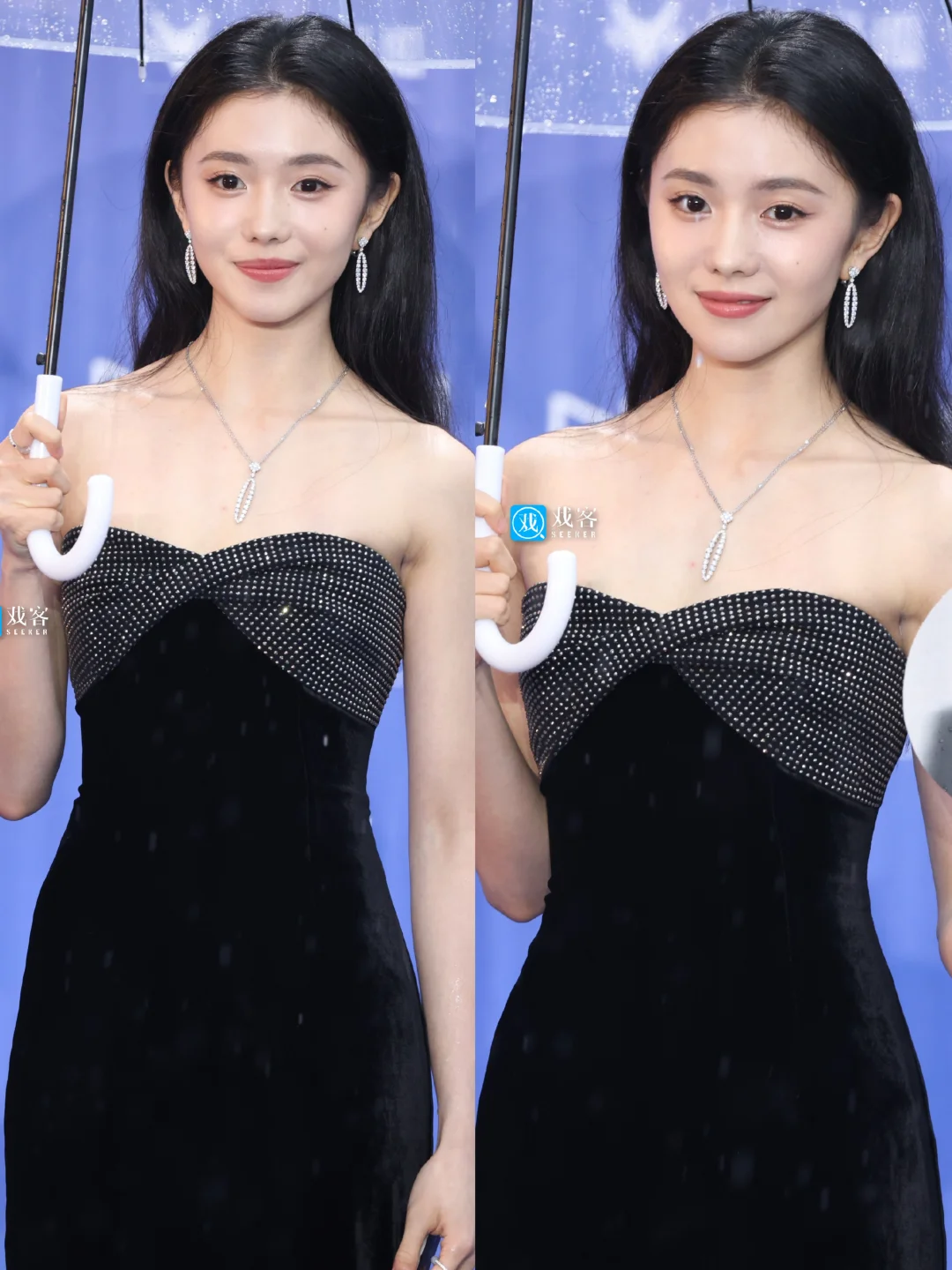 刘浩存今日北影节红毯,雨中撑伞一身黑色丝绒礼服裙亮相,同款礼服白鹿也曾穿过!