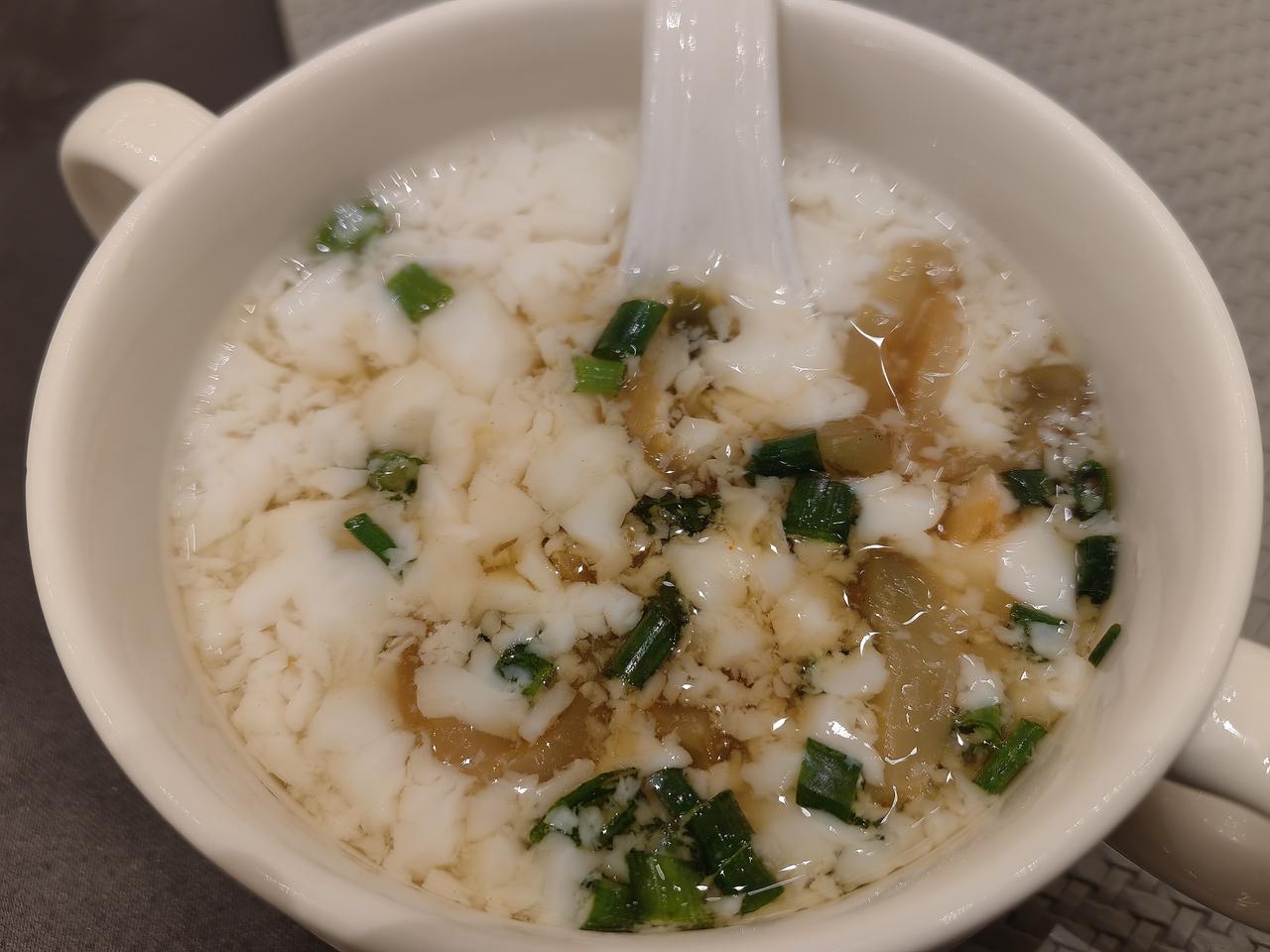 豆腐花,简单,有点儿时冬天做豆腐蹭豆腐脑的感觉。不过那时一是豆腐花刚出锅烫心,二是只加酱油,偶尔放点青蒜末。今早我加了酱油、葱和榨菜丝(想起明天要拜访浙大榨菜公大教授),略有点稀,还不错。
