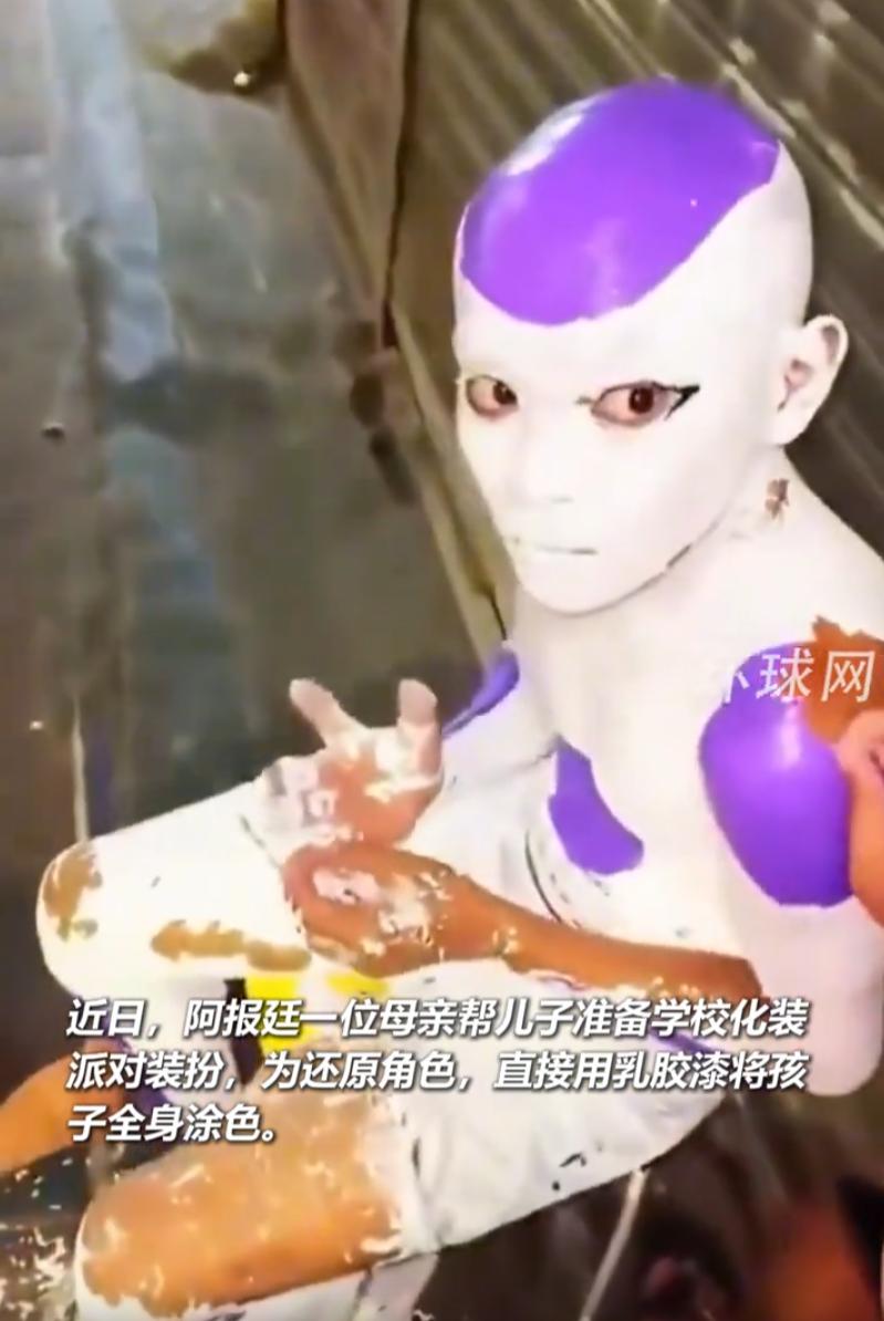这就是快乐教育的结果!阿根廷,一学校组织学生化妆排队,一位男生的母亲为了让儿子更出彩,直接将乳胶漆涂在孩子身上,给他cos成七龙珠中弗利萨的模样,结果却造成了化学灼伤