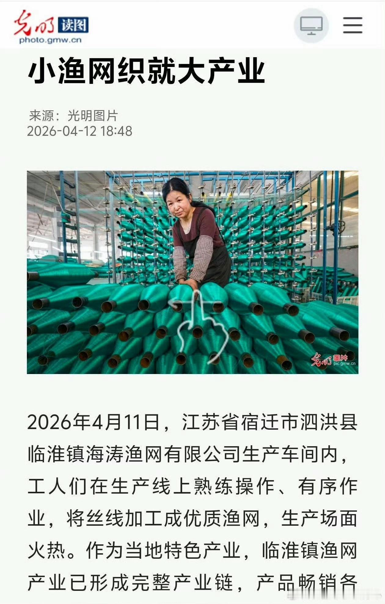 相信很多朋友这两天都看过BBC这条新闻:伊朗战争阴影下的中国经济增长(2026年一季度中国经济核心数据,较2025年四季度增长0.5个百分点,该数据由国家统计局 4月16日发布)。看到标题大家还觉得BBC不错,至少在肯定中国的成绩嘛。但配图直接让人蒙圈,我们这些外行一看配图还以为在生产导弹,还以为中国因为生产导弹让经济增长加速。实际上,这张配图是江苏宿迁渔网生产现场。我谢谢BBC的“春秋笔法”哦!