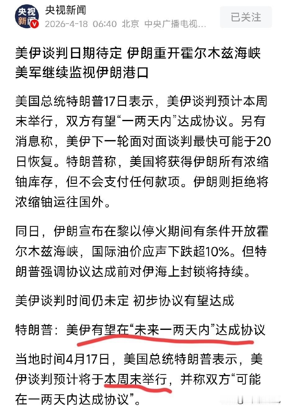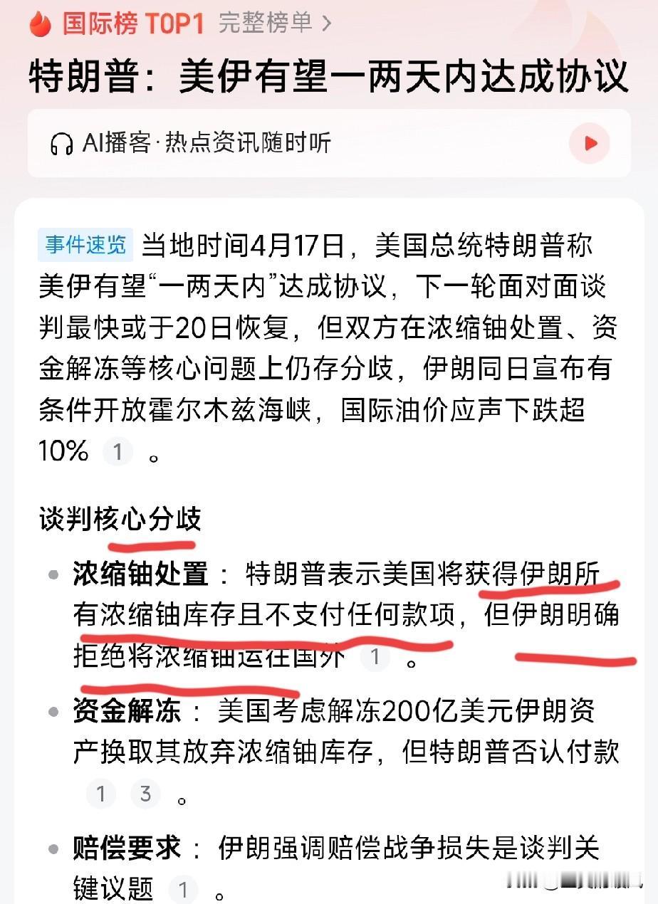 特朗普 17 日还乐观的表示:美伊谈判本周末举行,一两天内有望达成协议。他放话:美国将获得伊朗所有浓缩铀库存,但不会支付任何款项 。