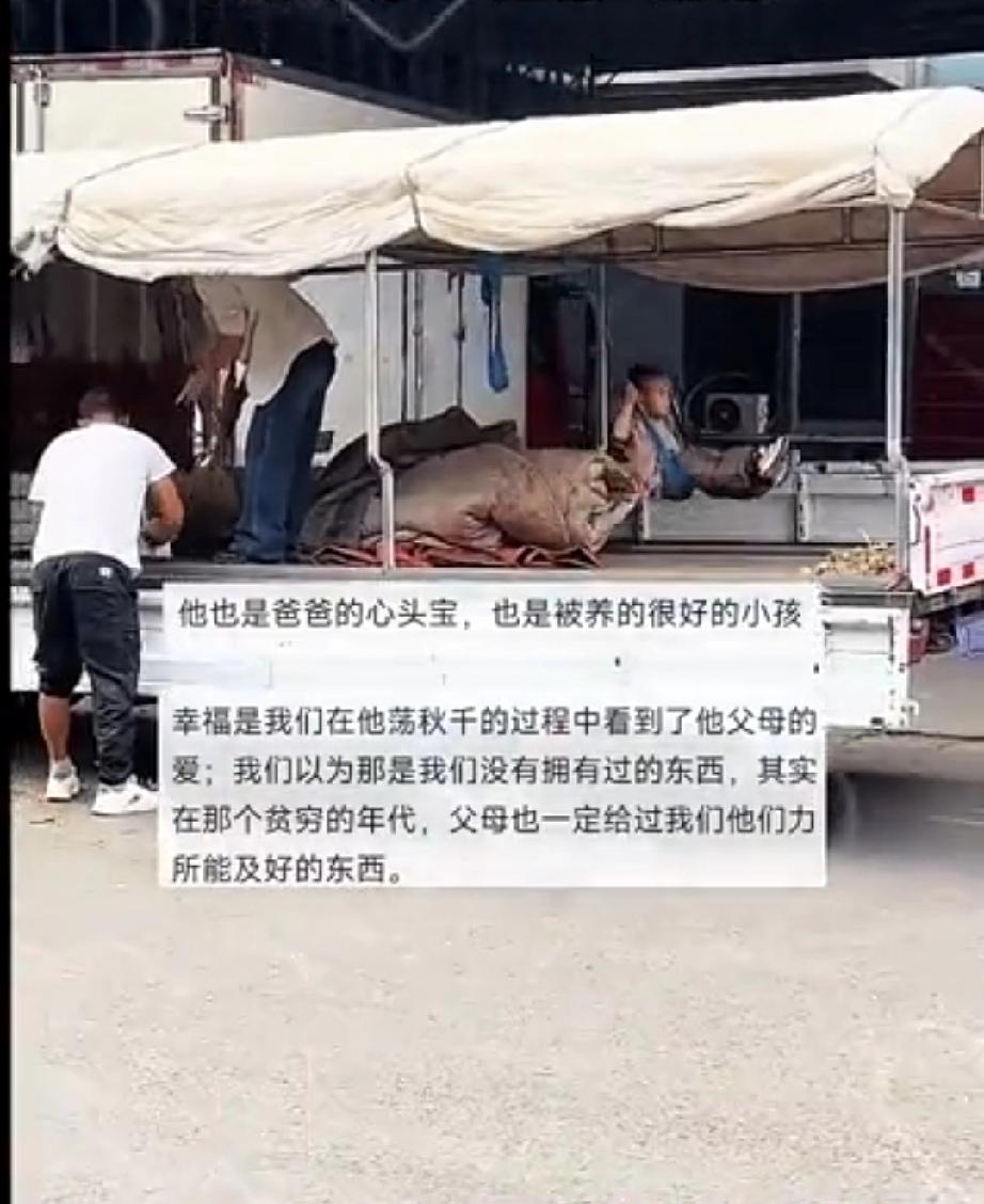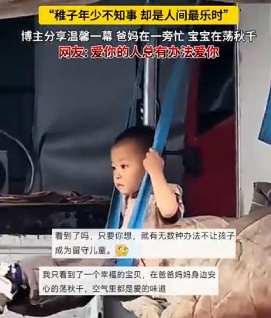 爸妈在一旁忙 宝宝在荡秋千大货车带儿童 稚子年少不知事却是人生最乐时