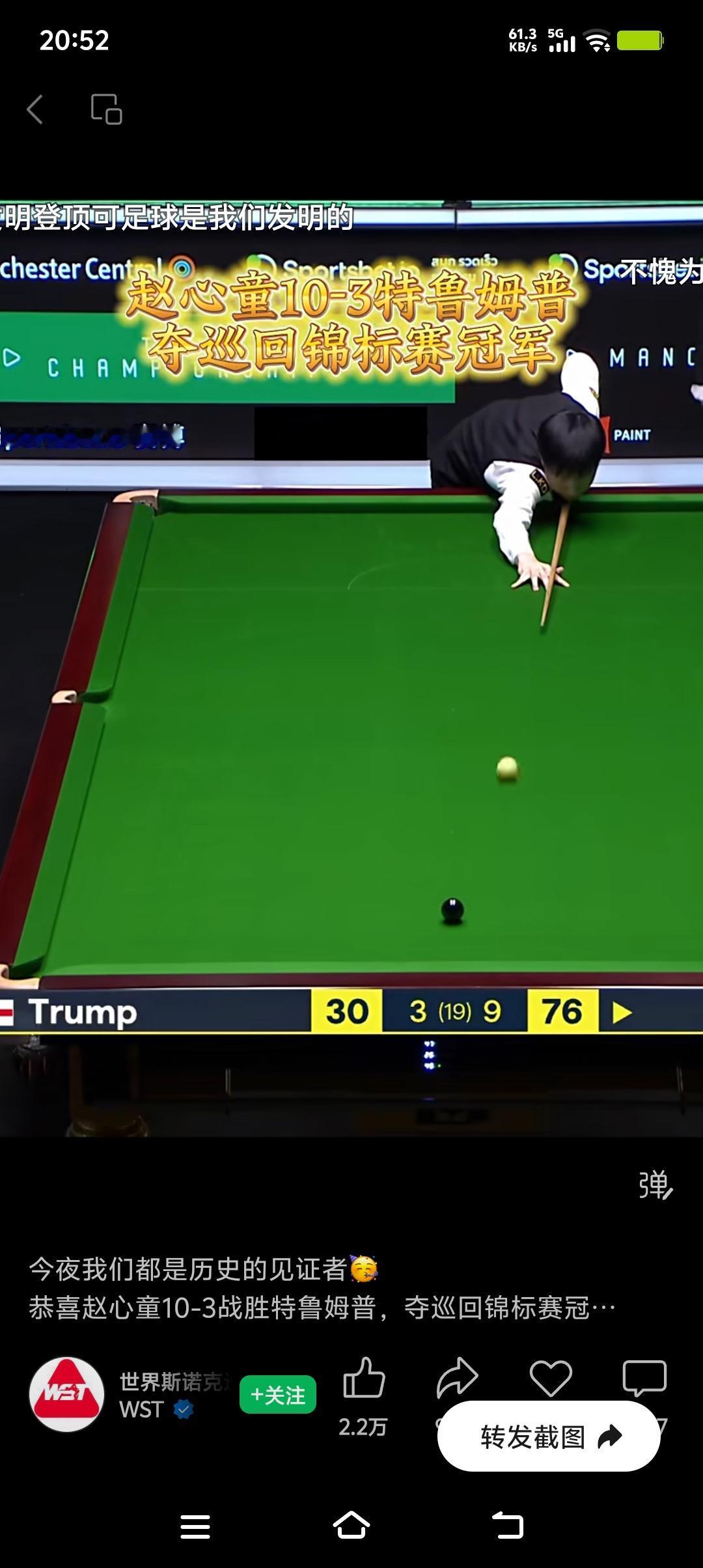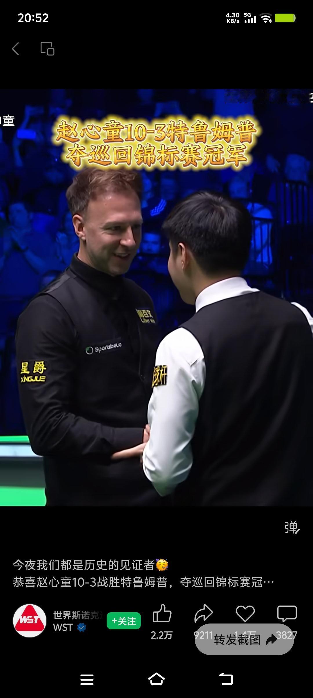 赵心童10-3大胜特鲁姆普夺冠,激动人心的时刻,斯诺克巅峰对决!