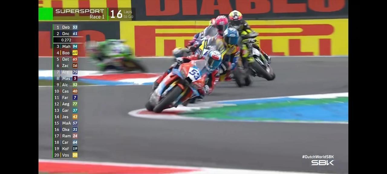 前十圈我们熟悉的那个53号车手瓦伦丁德比斯骑着张雪机车一直领跑是第一名,当还剩下九圈时落到第五名。