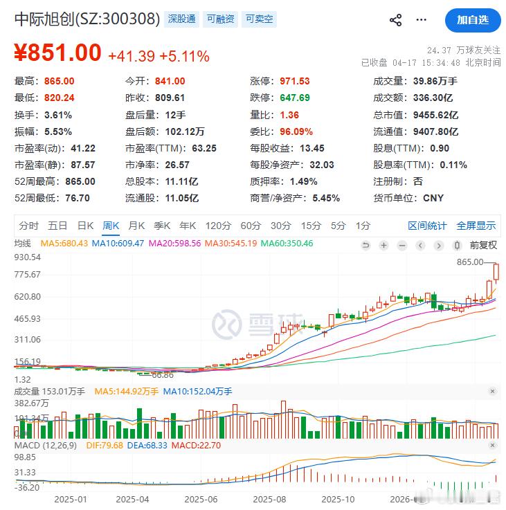 4月16日晚,茅台交出2025年年报,上市以来头一回营收、净利双双下滑。中际旭创一季报画风完全不同:营收近195亿元,同比增长192.1%;归母净利润57.4亿元,同比飙升262.3%。去年中际旭创辛辛苦苦一整年,净利润近108亿元。结果到今年,仅仅用一个季度,就拿下了去年业绩的一半多!二级市场上,中际旭创今日股价猛涨5.11%,报收851元/股,市值站上9455.6亿元,离万亿越来越近了。近一年来,中际旭创股价已翻7倍,累计涨近767%。
