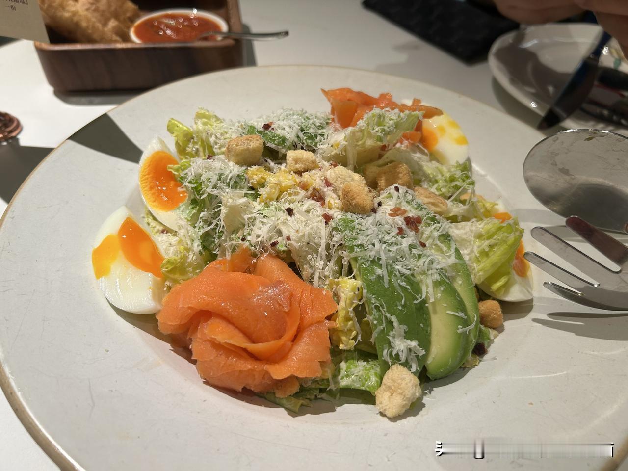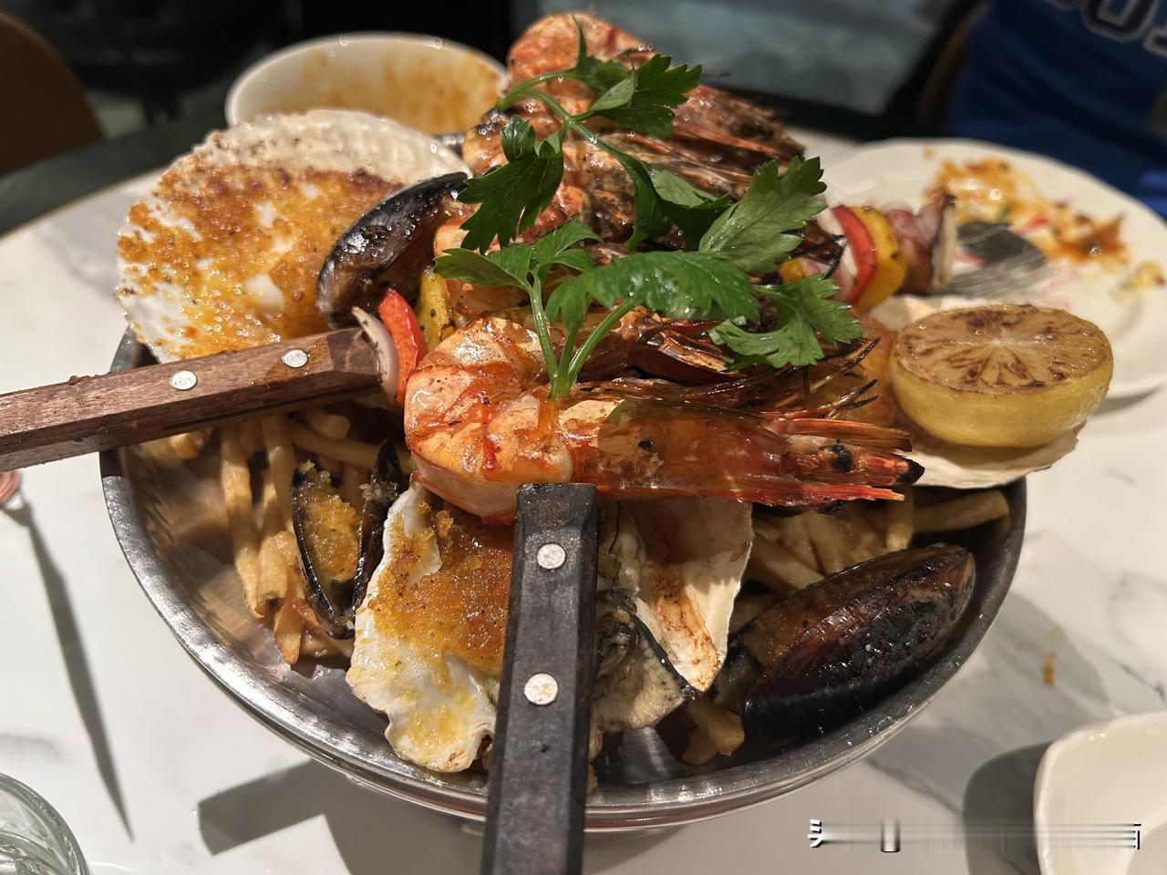 摄影师最喜欢的是烟熏三文鱼拌牛油果沙拉,海鲜拼盘下面垫的烤土豆丝,他认为不健康,只吃了三根,还不要打包,我都吃不动了,一根未尝。