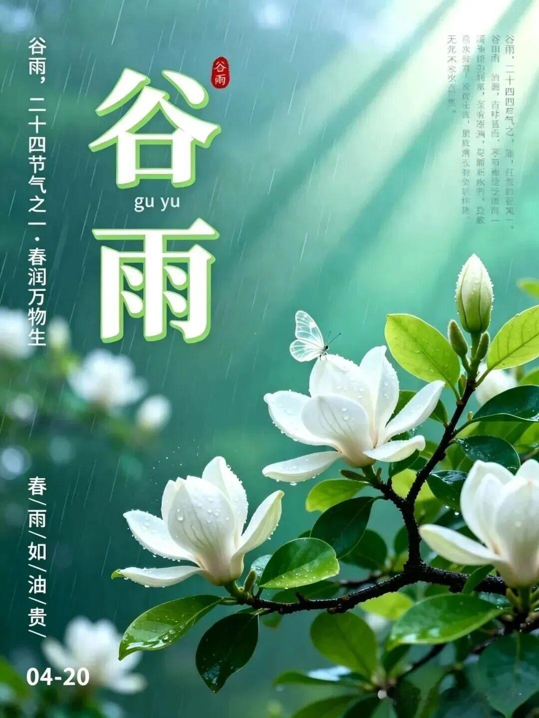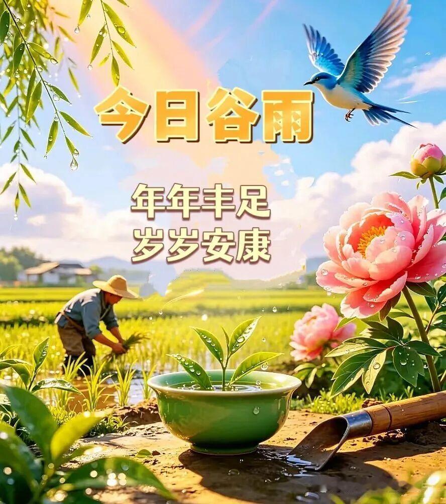谷雨季节人倍忙,点豆种瓜生希望。小河欢歌汗水淌,阳光普照禾苗长。辛勤劳动创辉煌,丰收在望笑声扬。祝你谷雨时节多快乐,幸福生活万年长!