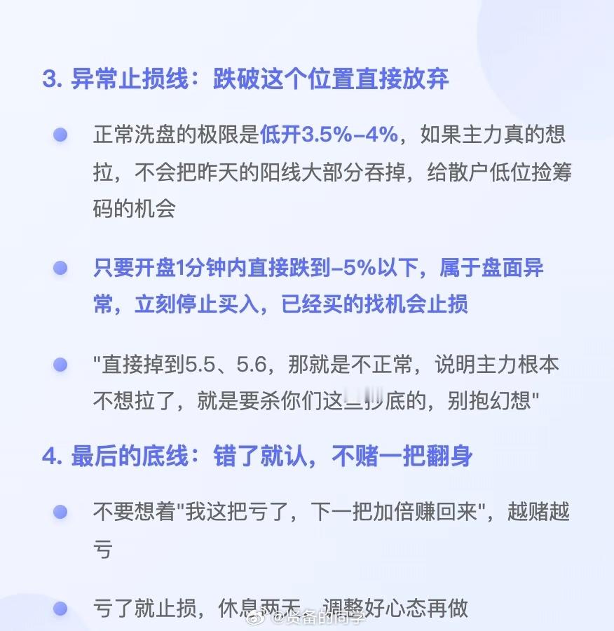 1.仓位铁律:永远不要孤注一掷2.建仓方式:分批买入,拒绝集合竞价一把梭3.异常止损线:跌破这个位置直接放弃