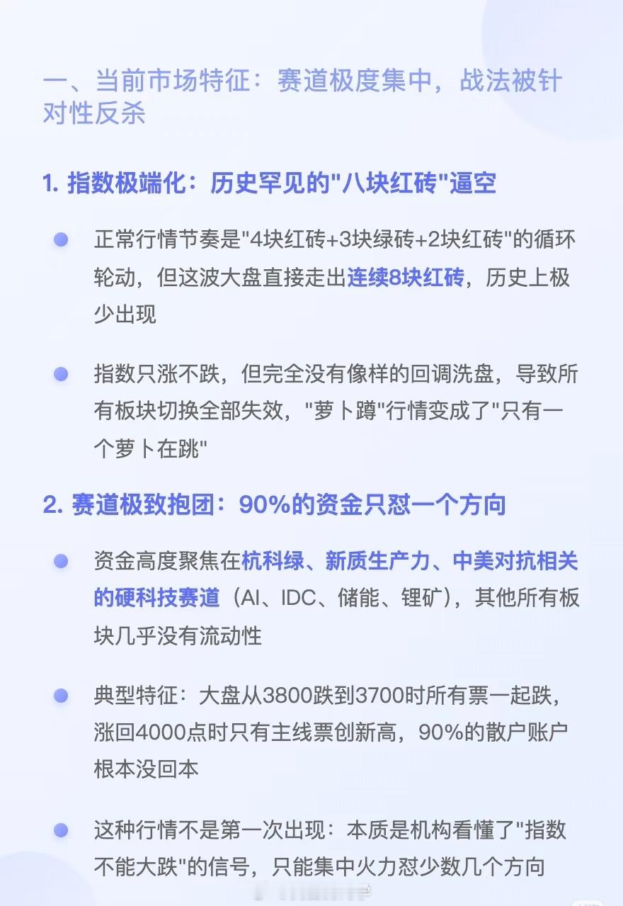 1.指数极端化:历史罕见的“八块红砖”逼空2.赛道极致抱团:90%的资金只怼一个方向3.最危险的信号:经典战法集体失效,出现历史级异常走势