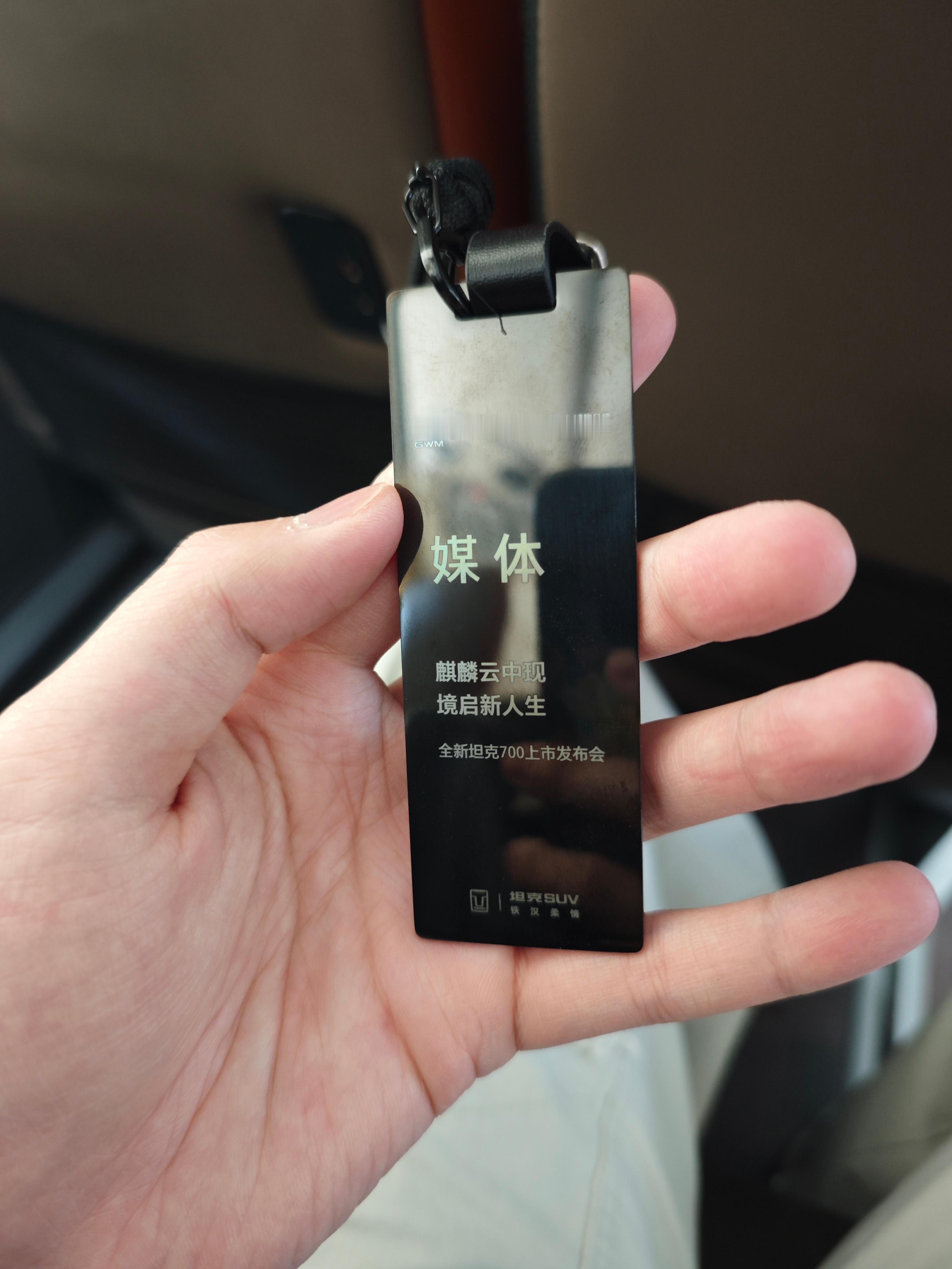 全新坦克700上市的媒体证有点不一样,一个长条的金属牌子,掰了半天,估计是车上某