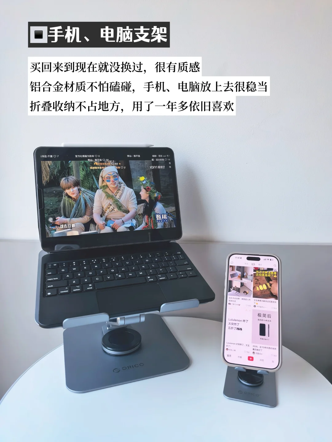 铝合金材质不怕磕碰,手机、电脑放上去很稳当折叠收纳不占地方,用了一年多依旧喜欢