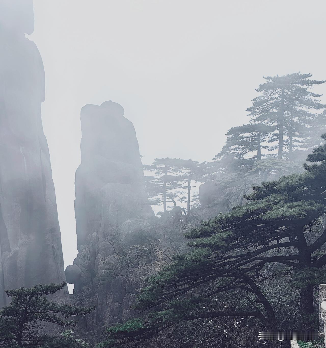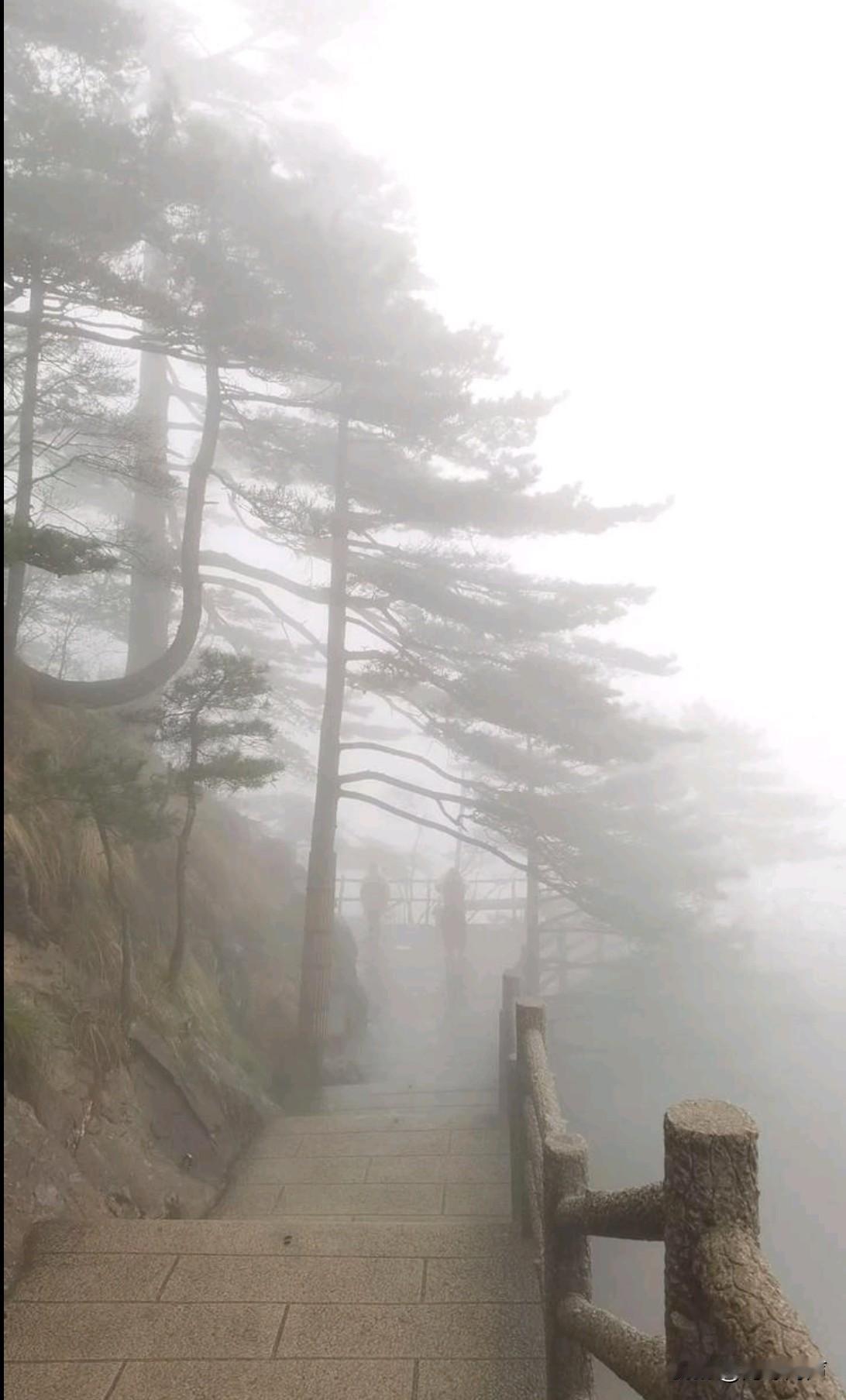 浓雾笼罩的黄山,虽剥夺了眼观盛景的快意,却赋予了这份旅途一份独有的朦胧诗意。它让前路变得扑朔迷离,恰如我们漫漫人生,总有诸多不期而遇的意外,为前行之路蒙上一层厚重的面纱。倘若人生旅途,一切皆早已注定、一目了然,少了未知的期待与探寻的惊喜,反倒会生出被宿命裹挟的索然无味。既然看不清远方盛景,不如暂且放下执念,在这雾色中安顿身心,静心感受当下的一呼一吸,珍惜每一次不期而遇的相逢,不负这场突如其来的朦胧邂逅。