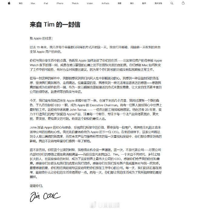 库克不再担任苹果CEO苹果官宣:9月1日起约翰·特纳斯接替库克任CEO,库克转任执行董事长。这是2011年库克接替乔布斯后苹果首次CEO交接,在其带领下苹果市值已增长约24倍。